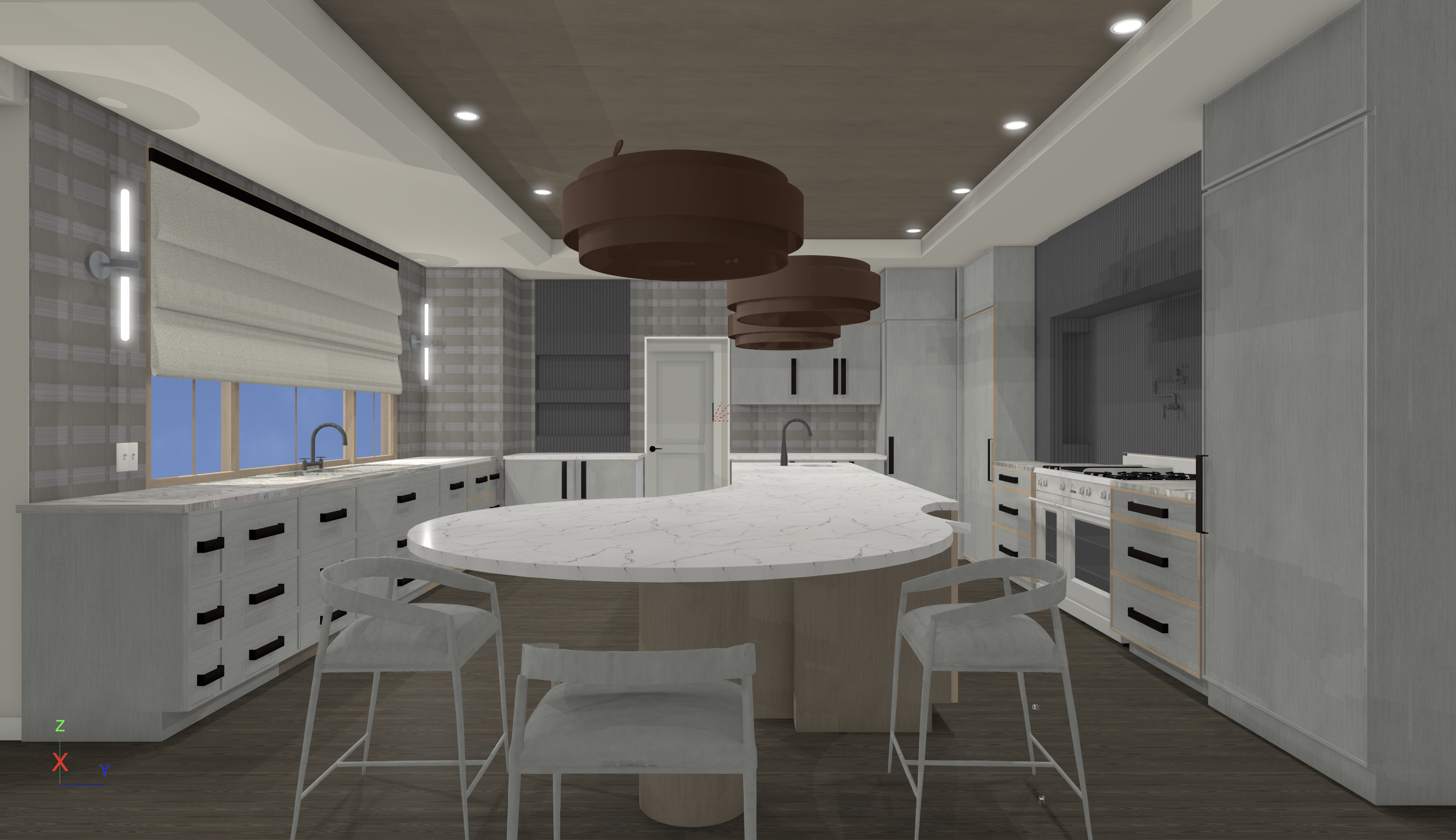render this kitchen add a black upholstery to the stool a black ring around the pendant lights style minimally with a tree books vases i had a fruit bowl and decor on the center island make photo real add natural lighting keep all tile and hardware and cabinet color the same the same