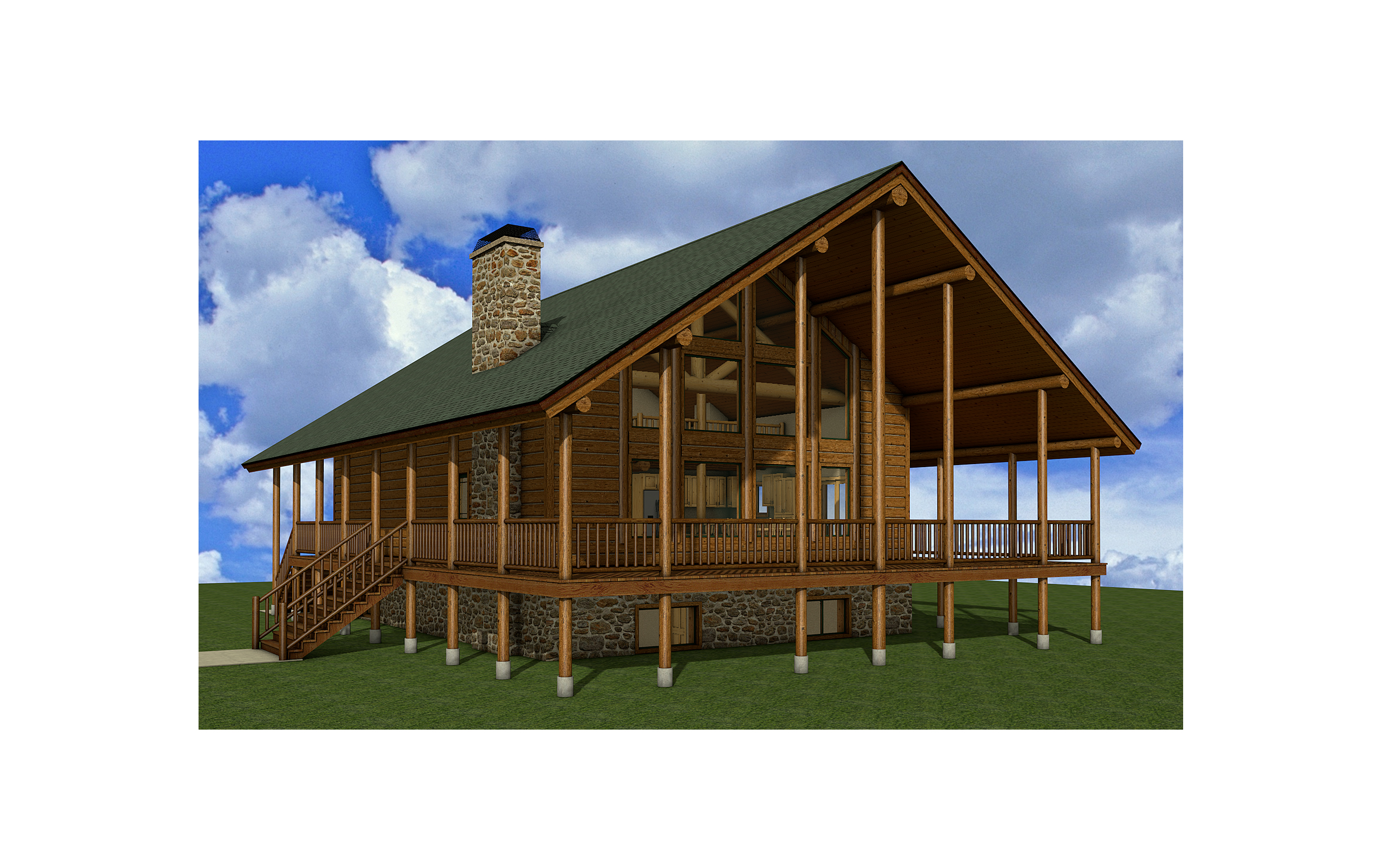 a modern rustic house with log posts and accent beams retain the exact structure window arrangement deck columns rooflines foundation height trusses and proportions exactly as shown in the reference image add a gravel driveway extending toward the house and integrated naturally into the terrain surround the property with a lush dense forest of tall mixed evergreens and hardwoods sun is shining across the front of the home and grass create ultra realistic lighting crisp shadows detailed textures in the siding and glass reflections and a partly cloudy sky with light atmospheric depth render in hyper realistic architectural visualization quality 8k resolution it is the winter season add a metal roof make the wood all a light color natural finish