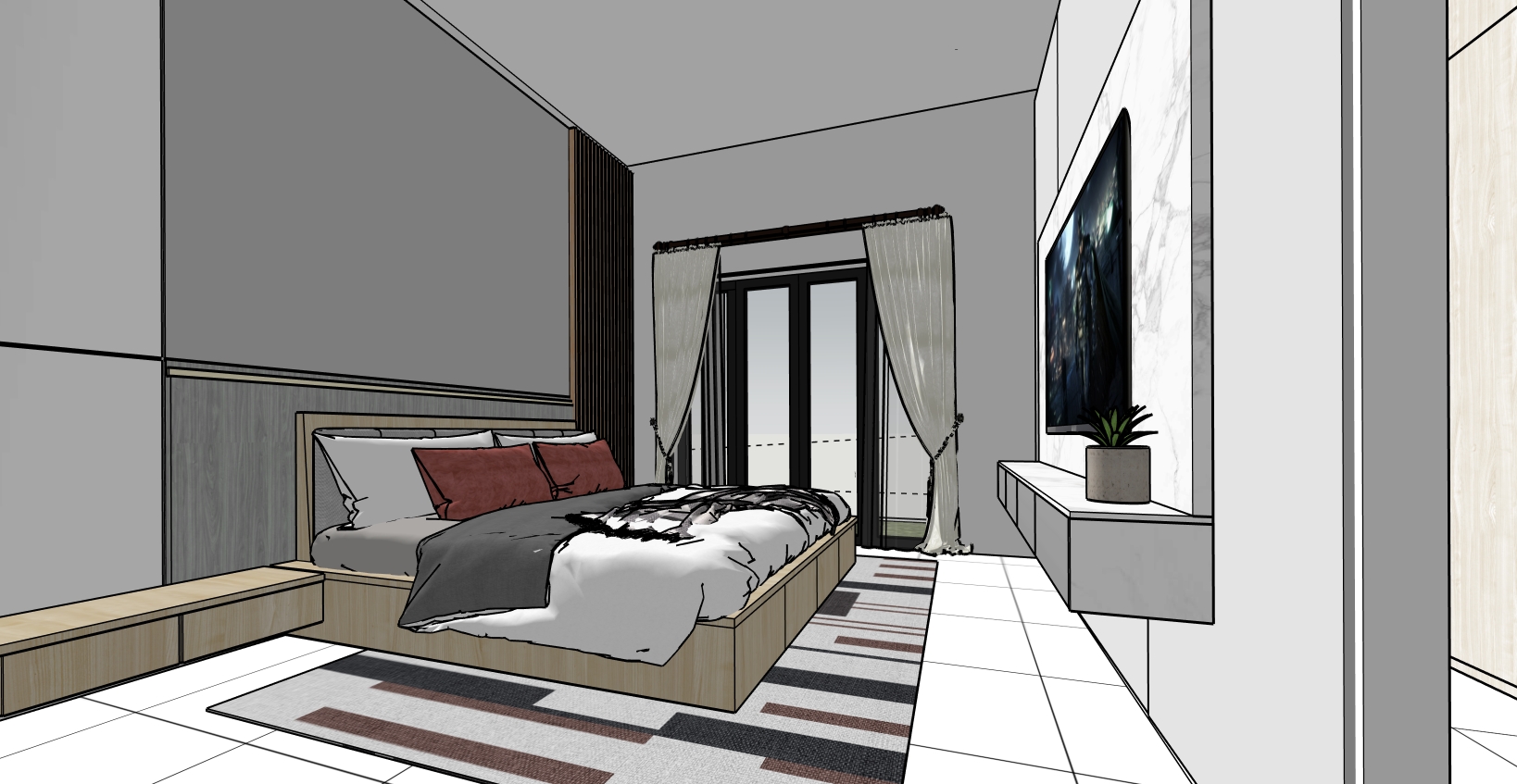 dont make changes to the model keep the exact geometry layout furniture placement window configuration ceiling design and the initial material shown in the model exactly as shown photorealistic architectural interior render of a modern minimalist bedroom with warm neutral tones and scandinavian japanese inspired design bedroom with a light wood platform bed and upholstered headboard layered bedding with neutral fabric textures and accent pillows a contemporary patterned rug placed under the bed on light tiled flooring with subtle reflections wall behind the bed featuring a combination of vertical wooden slat panel and grey wall panel detailing following the exact design shown in the model in front of the bed a floating minimalist console cabinet with a mounted television on a marble wall panel a small decorative potted plant placed on the console black framed sliding glass doors with sheer white curtains allowing soft natural daylight into the room the window and sliding door frame configuration must remain exactly the same as in the model minimalist bench at the side of the bed with light wood material soft natural daylight combined with warm ambient lighting realistic materials subtle reflections detailed fabric textures realistic wood grain soft shadows global illumination photorealistic architectural visualization