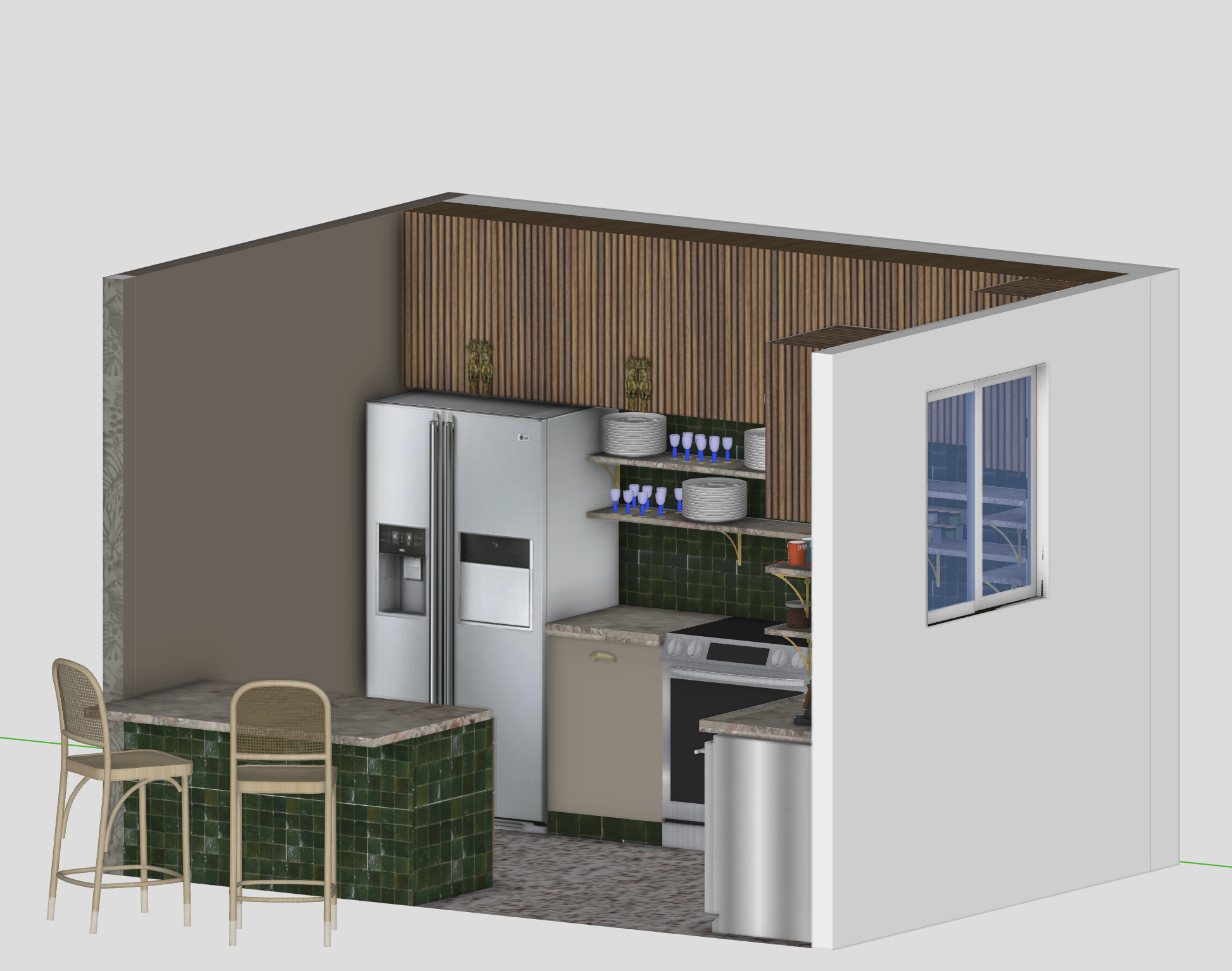 a modern kitchen interior with a cozy and inviting atmosphere the walls are painted a subtle taupe color providing a warm backdrop the top kitchen cabinets features elegant wooden slats in a rich golden oak wood finish the floor is tiled with apink hues terrazzo the bottom cabinets are the same color as the walls are a smooth beige the countertop is a marble stone with light pink and beige tones the barstools have natural wicker seats and backs with light wood frames an array of ceramic pink and beige plates and green and clear glassware is neatly arranged on open wooden shelves the light streaming through the window adds a soft natural glow enhancing the serene and stylish feel
