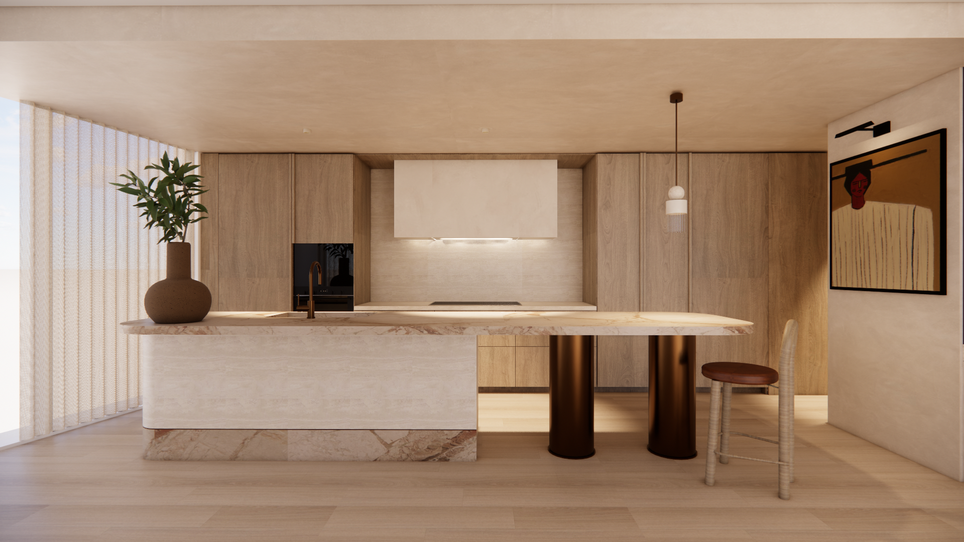 add some cutting boards to the backline of the kitchen and to the right add some salt and pepper shakers that are in a timber colour add a slimline still that has a archedx back on it and put it where the origional stool is right now