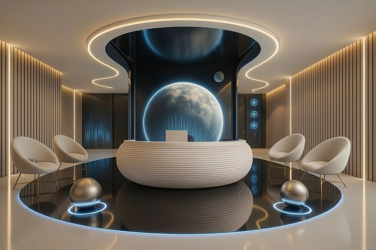 replace the ceiling light above the reception desk with a more sculptural organic recessed lighting feature instead of a simple oval ring create a large central recessed ceiling shape with a continuous soft warm led outline and smooth flowing curved extensions on both the left and right sides like elegant wave like lines the feature should feel futuristic fluid and integrated into the ceiling architecture with a refined luxury look keep it centered above the reception desk and proportional to the circular black floor area below maintain soft warm indirect lighting realistic glow clean edges and symmetrical composition do not change the reception desk walls chairs back feature wall floor reflections or camera angle
