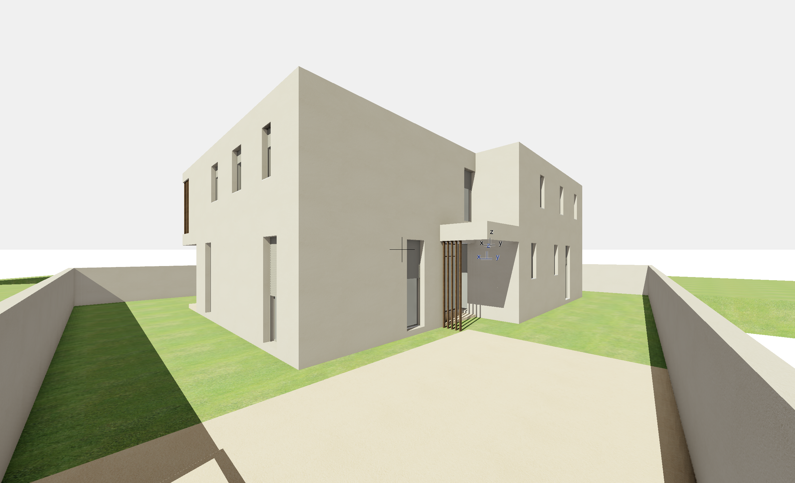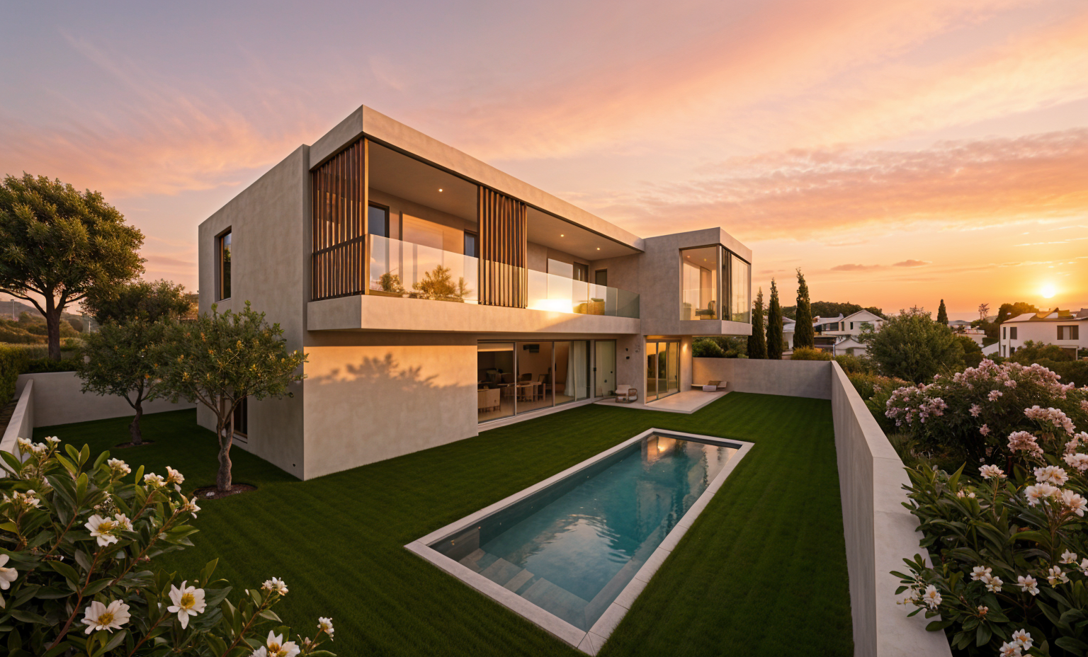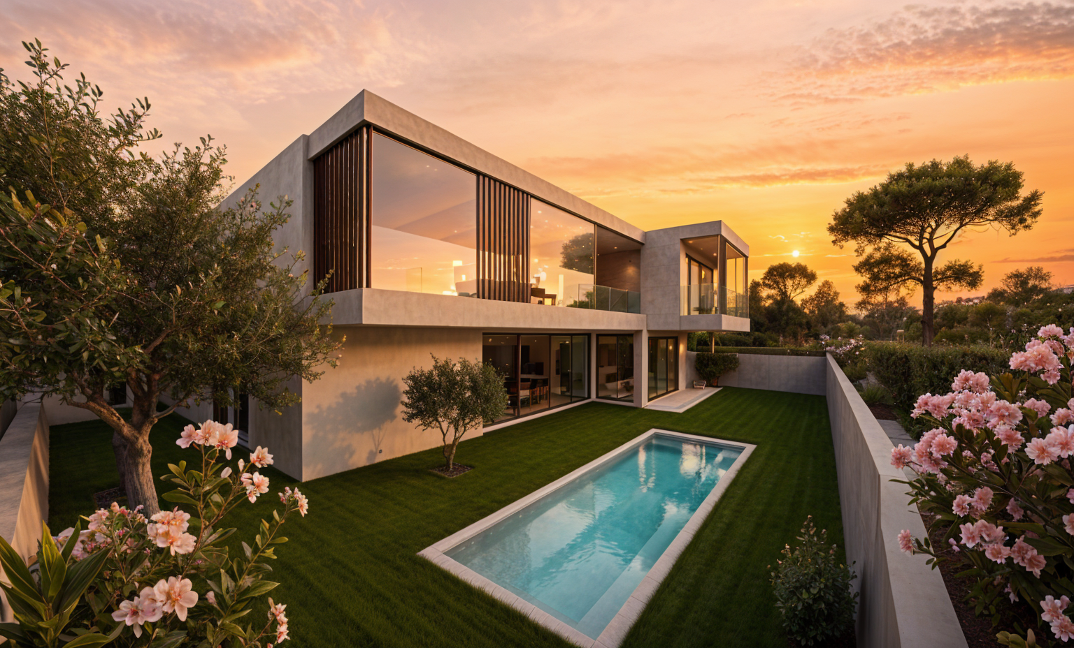 reflects on the windows mediterranean trees and villas in the background add some olive trees near the house a bit of sun on the facade ajoute des lauriers roses sun set in orange and pink sky more trees in the background the facade is more beige more reflects on windows