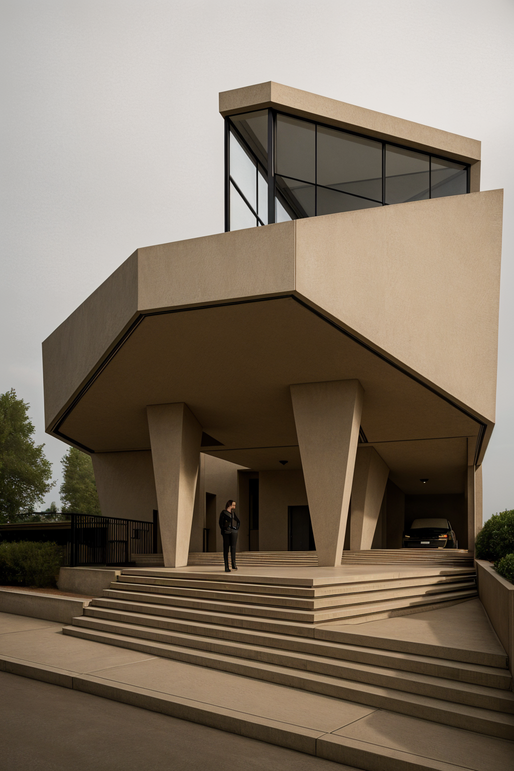 perspective shot a spacious modern waiting area with minimalist design the ceiling is a soft taupe providing a warm and inviting atmosphere the walls are a light cream complementing the taupe ceiling the seating consists of sleek angular couches in a light camel brown leather giving a chic contrast floor to ceiling glass walls allow for ample natural light subtly reflecting off the polished concrete floor in a muted sand color potted plants in deep green are scattered throughout adding a touch of nature and vibrancy the background reveals an open door made of light wood enhancing the earthy tones of the space the overall atmosphere is calm modern and inviting with a focus on neutral tones and natural light