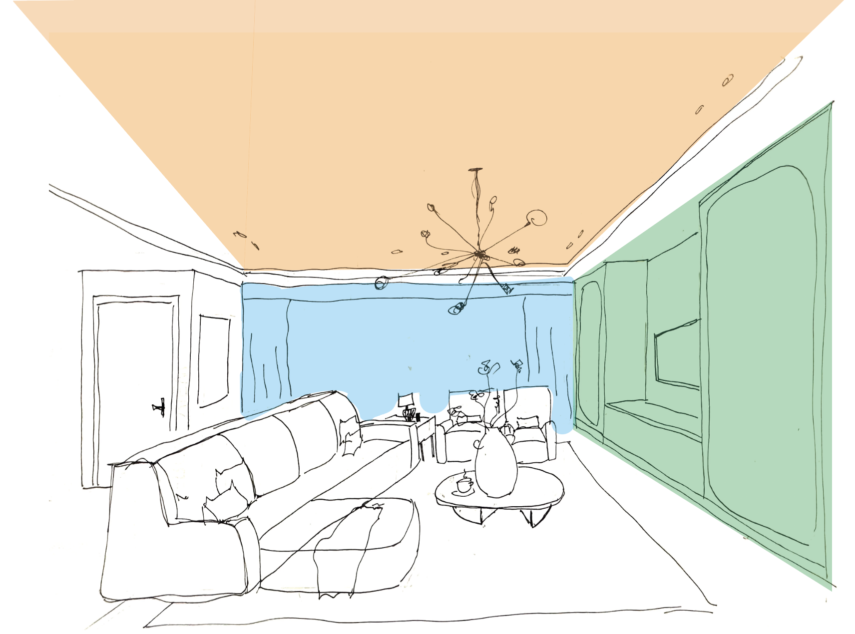 mid century modern tv room book shelves in 200m depth backing in wallpaper in the middle of shelves is tv section in 100mm depth in dark wood flooring in walnut wood and skirtings dark blue l shape sofa with leather side chairs and brass coffee table curtains cover entire window rendered in photo realistic