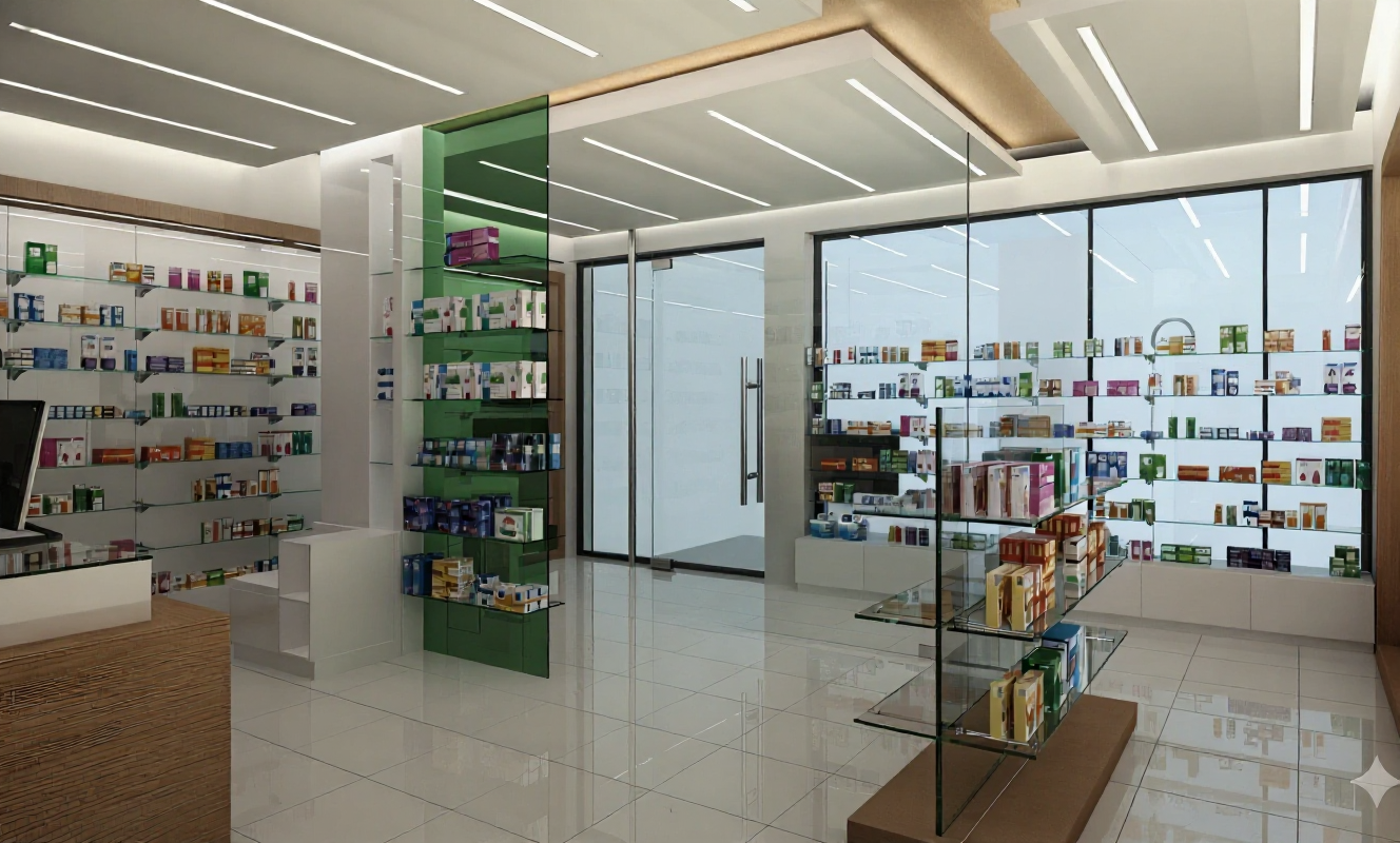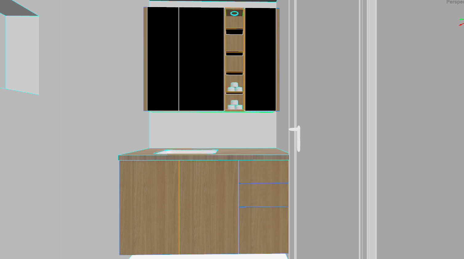 the walls floors and countertops are beige marble leds in the niches and under the mirrored cabinet the ceiling is white and there are 4 spotlights on the ceiling