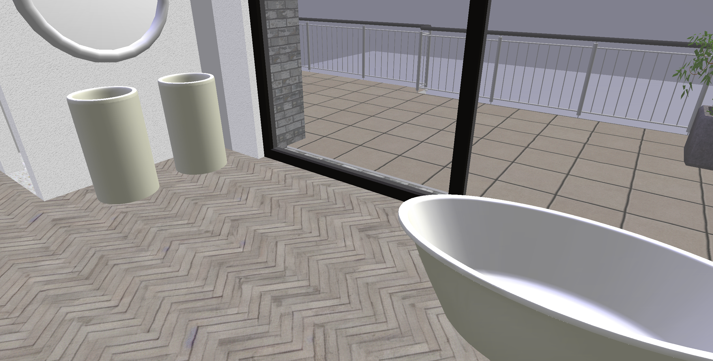 genau dieses rendering berarbeiten fotorealistisches innenraum foto exakt dieselbe perspektive und kameraposition wie das hochgeladene referenzbild 100 identische raumgeometrie exakt gleiche m belanordnung exakt gleiche verlegeart und richtung von parket wie vorlage exakt identische fensterpositionen mit gleichem ausblick durch die fenster weiches nat rliches tageslicht leicht schr g einfallende sonne durch die grossen fenster geschlossene r ume k nstlich ausleuchten sanfte realistische schatten blickrichtung ist nach osten sonnenlicht kommt von s den realistische materialien echte holztexturen stoff mit leichten gebrauchsspuren hochwertige oberfl chenreflexionen kleine gr npflanzen lavabo aus marmor collemandina grigio in braungrau dunkel dahinter je eine vola standarmatur fs2 edelstahl keine ablagefl chen badewanne austauschen mit modell reflexlight von antonio lupi in klarglas braungrau dunkel mit standarmatur fs1 edelstahl auf fensterseite links hinten bei den lavabos hat es einen schrank f r badet cher schrankfronten alle grauglas gl nzend ohne griffe parket ruhig und hellgrau vollkommen rahmenloser und hinterleuchteter spiegel rechts hinter den lavabos ist die nicht sichtbare dusche hell ausgeleuchtet alle sichtbaren w nde sind sichtbeton graues badetuch l ssig ber badewanne werfen leichter tagesvorhang in graubeige auf der rechten seite des fensters runde filigrane schwarze einbauspots vor der fensterfront sehr moderner minimalistischer look nat rliche farbwiedergabe golden hour feeling aussen stadtleben in z rich wir sind im 3 obergeschoss das bild muss wie eine professionelle fotografie aussehen es soll ein echtes und reales foto sein canon eos r5 35 mm festbrennweite f 2 8 hyperrealistisch dslr qualit t raw aufnahme 8k aufl sung extrem scharf perfekte tiefensch rfe professionelle architekturfotografie