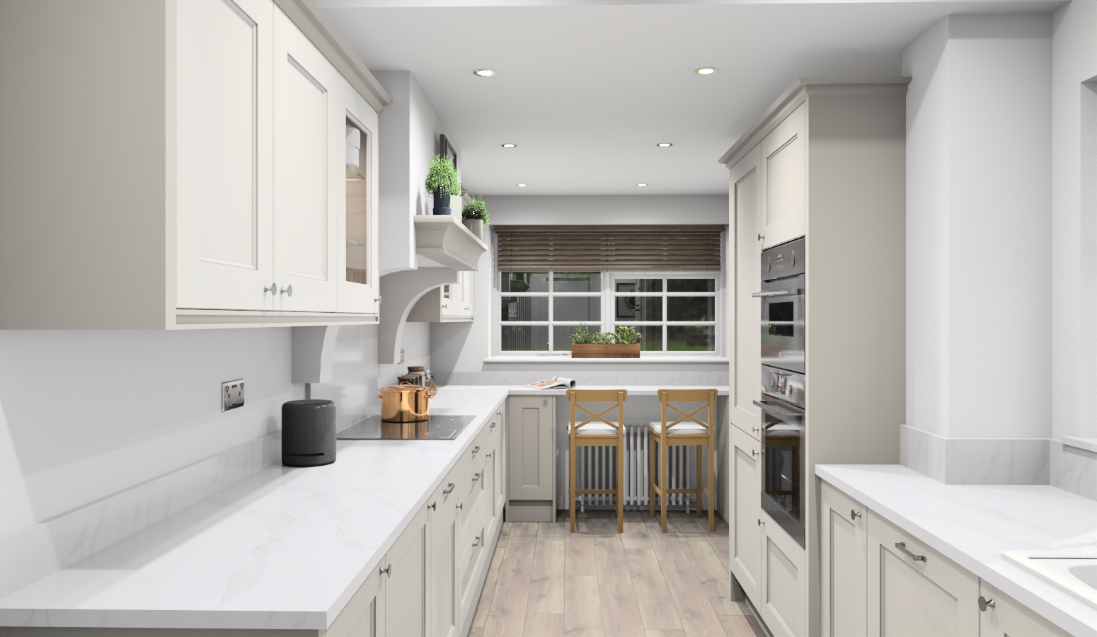 make this image 8k hyper realistic as if it were taken via an iphone camera artificial lighting should beautifully blend with natural lighting showing the subtle grain effect on the painted ash kitchen door keep dimensions the same and in a landscape format keep dimensions the same midday sunlight coming through large windows casting realistic shadows and reflections shot with a dslr camera 35mm lens shallow depth of field ultra high resolution photorealistic ray tracing global illumination highly detailed textures realistic lighting cinematic composition