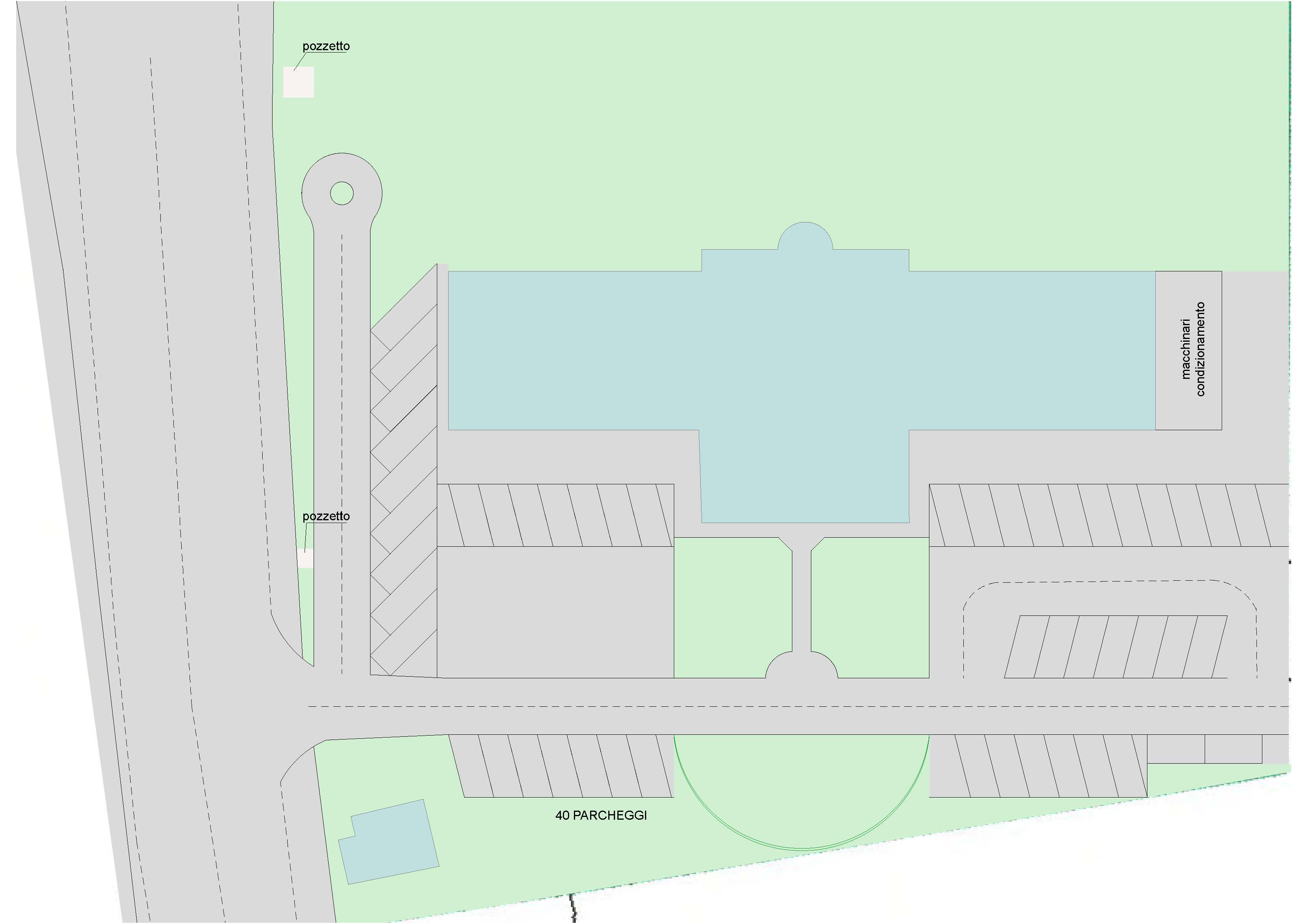 in colore verde il giardino in colore grigio i parcheggi l edificio centrale ha due piani