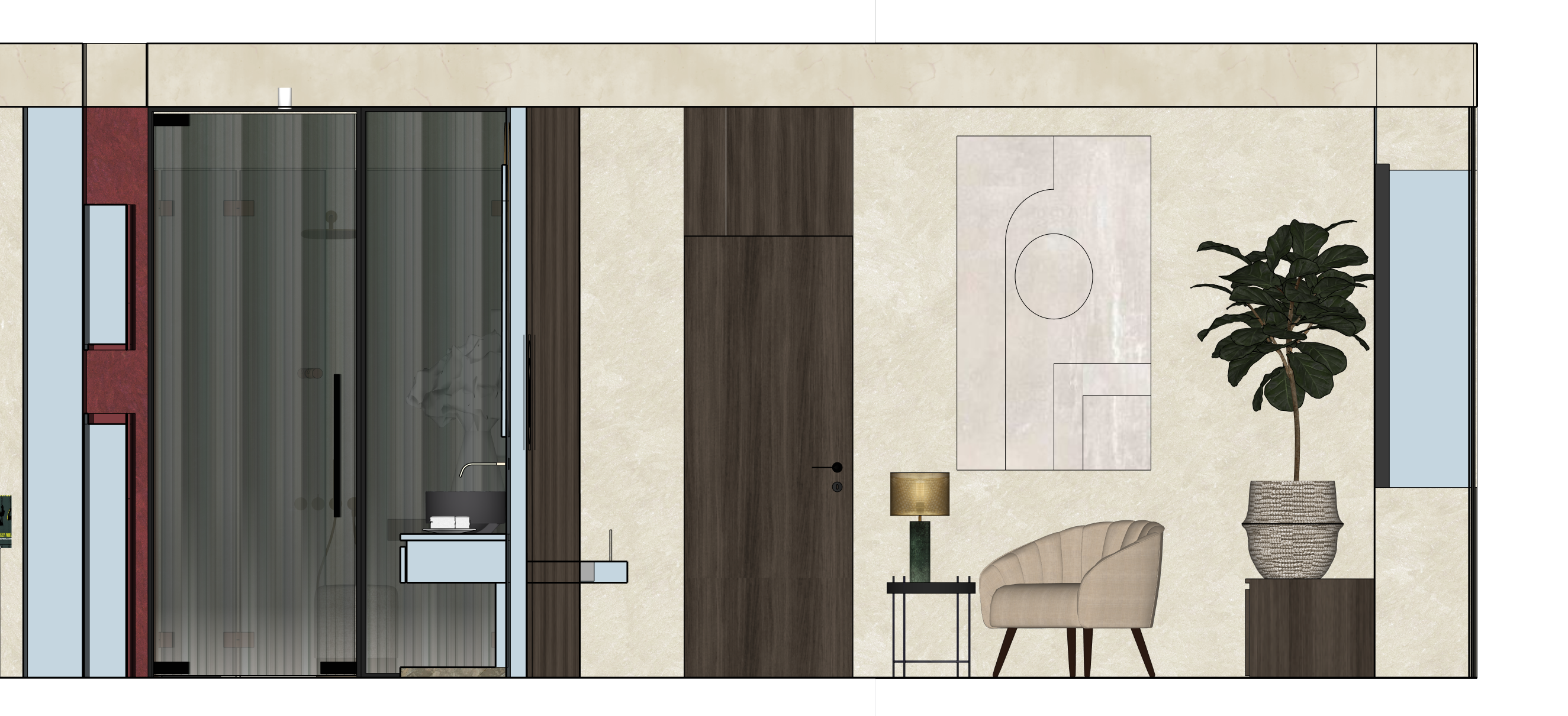 front elevation architectural rendering of a contemporary interior composition including bathroom and lounge area maintain exact composition proportions alignment and all architectural elements do not modify layout geometry spacing or relationships between elements preserve all existing materials textures colors and finishes exactly as shown beige stone effect wall cladding with soft natural variation dark wood vertical paneling and door with a matte finish black metal framed shower enclosure with ribbed frosted glass panels minimal wall mounted sink with integrated faucet deep burgundy vertical architectural accent on the far left light neutral ceiling band above furniture and decor must remain identical in position scale and style upholstered armchair in soft beige fabric with curved backrest small black metal side table with thin structure table lamp with green base and warm fabric shade emitting soft warm light decorative wall artwork with minimal geometric pattern large indoor plant with broad green leaves in a textured neutral vase low dark wood cabinet under the plant white background only no environment no exterior context no additional elements apply a refined high end architectural visualization style warm soft diffused lighting throughout the scene subtle glow from the table lamp not overexposed warm tone soft shadows and ambient occlusion to enhance depth and layering realistic material rendering matte wood slightly textured stone soft fabric translucent ribbed glass controlled reflections on glass and metal frames ensure a warm color balance and avoid cold or bluish tones ultra clean composition sharp edges high realism premium architectural visualization quality
