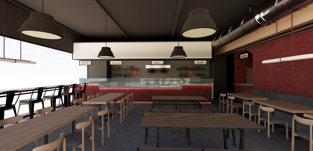 create a highly realistic interior render of a contemporary casual restaurant from a frontal viewpoint facing the open kitchen and bar use neutral lighting overall the bar counter should be clad with red tiles that have a subtle reflective finish illuminated by a warm led strip beneath the counter that creates an indirect glow on the red surface render the open kitchen with stainless steel equipment shelves holding cookware and a central hood above the bar include a large translucent light box with soft neutral illumination and industrial pendant lamps hanging from the ceiling maintain the exposed black ventilation duct on the right side use white oak melamine wood for the dining tables and chairs with less wood grain for a more subtle surface include long communal tables with dark slatted wooden benches and individual wooden chairs the floor should be polished concrete with a soft sheen on the right side of the scene include a long booth seat against a subtle red lime wash wall through the left side window show a realistic urban cityscape with soft daylight buildings trees and faint street activity bright but not distracting keep the overall ambiance modern clean softly lit and true to materiality