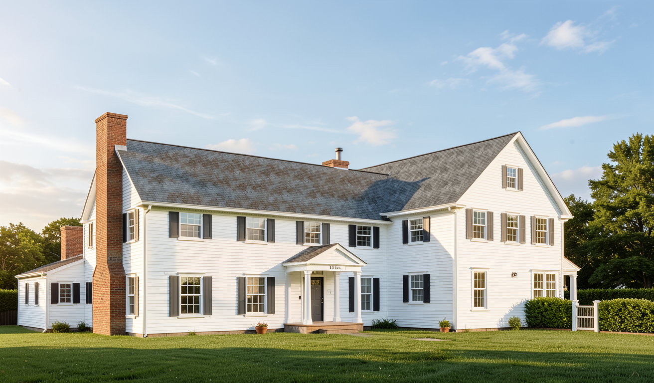 horizontal white siding white trim lead gutters