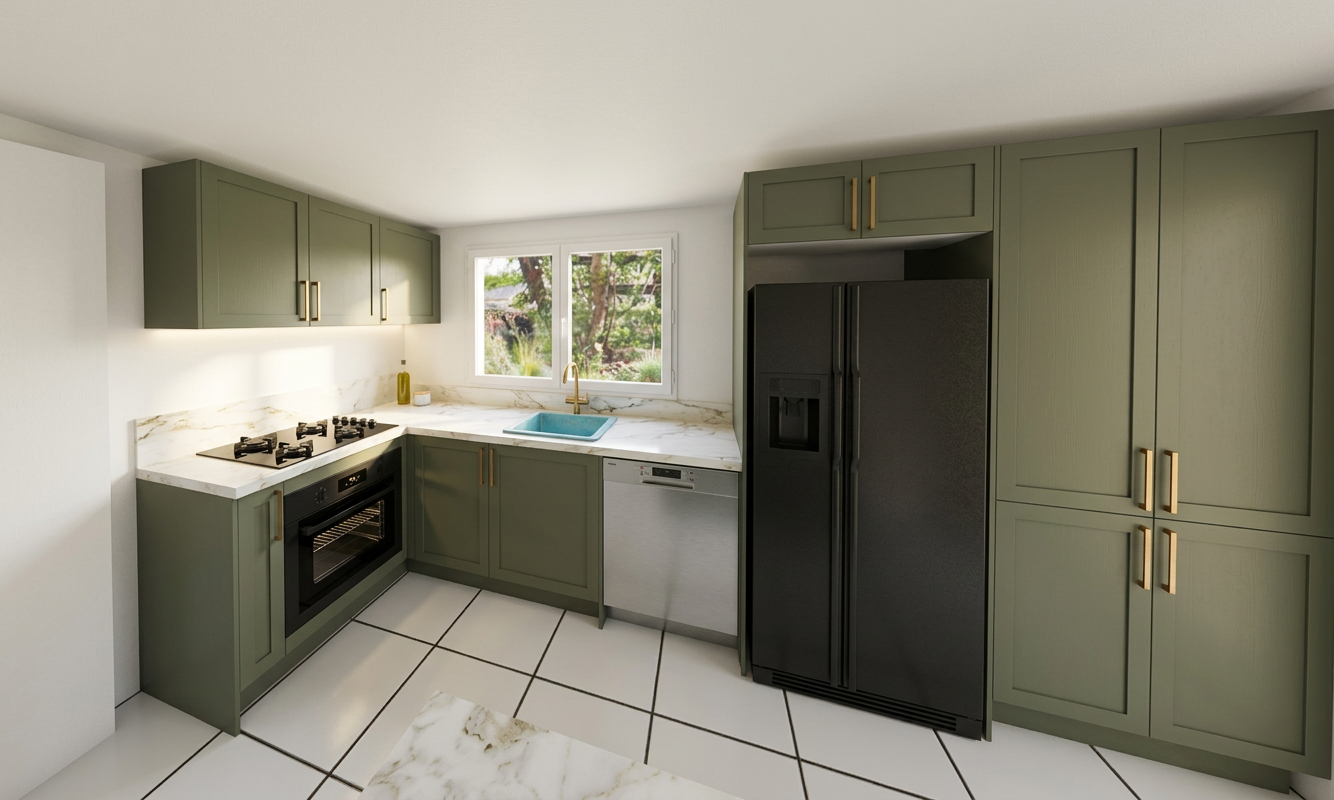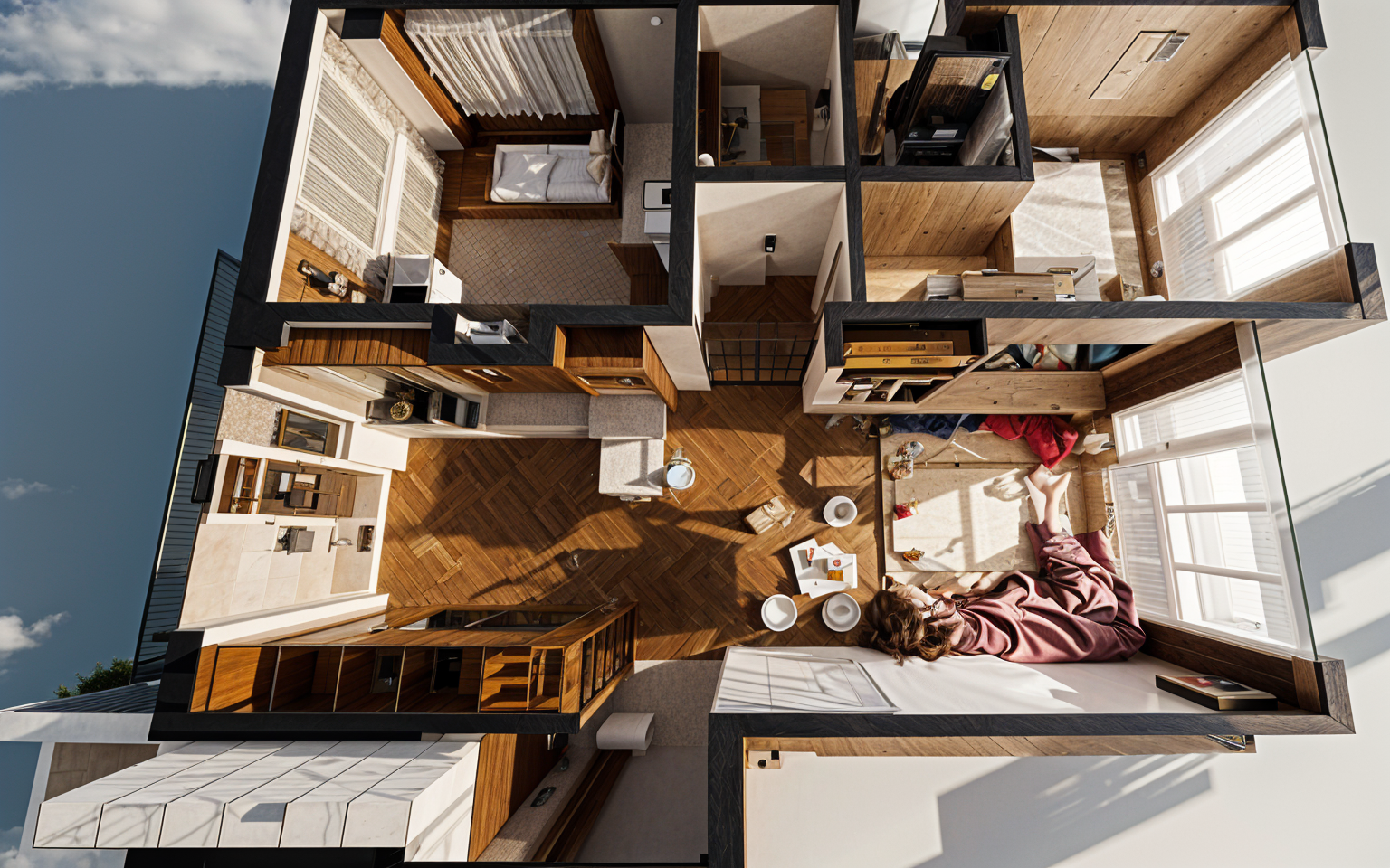 colours to remain accurate as per original given picture wood texture to be subtle drawers and all table top surface in warm beige laminate with a soft blush pink undertone and subtle wood grain texture niche in light beige microcement and only bottom till study table in muted soft pink subtle wood grains top half of carpentry in solid colour light beige and only bottom till study table in muted soft pink subtle wood grains 2 doors full height cabinet in mirror recessed 150mm height skirting ontop ceiling in off white bed headboard in solid colour light beige floor in muted light beige vinyl subtle grains ceiling fan in white walls in off white sunlight coming in from the right side of room