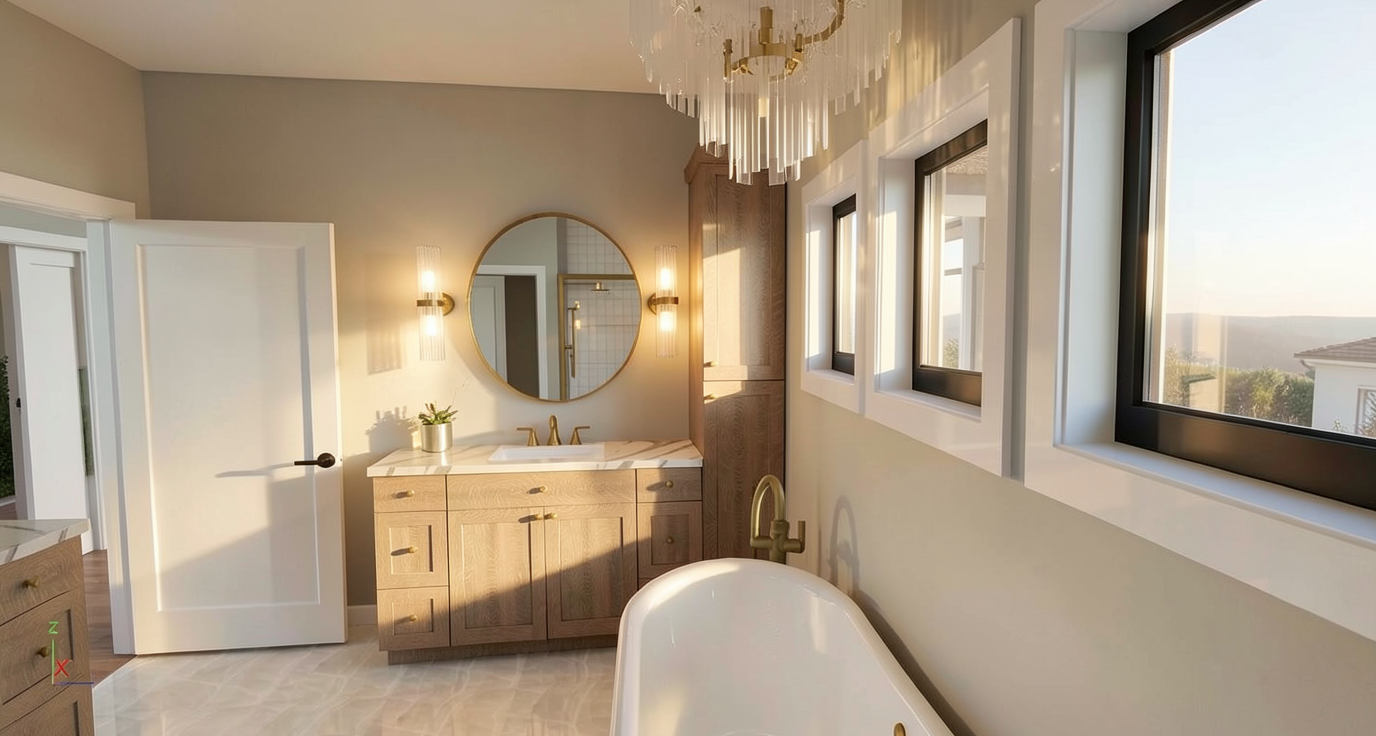 render a photorealistic 3d perspective of this house in a fenced backyard reference the current material style just enhance them keep model geometry the same windows doors roof walls make a grassy vegetation and young leafy trees do not change the view only enhance the current materials white and black vertical corrugated metal siding horizontal cedar siding and make the landscape nicer vegetation glass reflections and a vibrant clear sky with light atmospheric depth render in hyper realistic architectural visualization quality 8k resolution