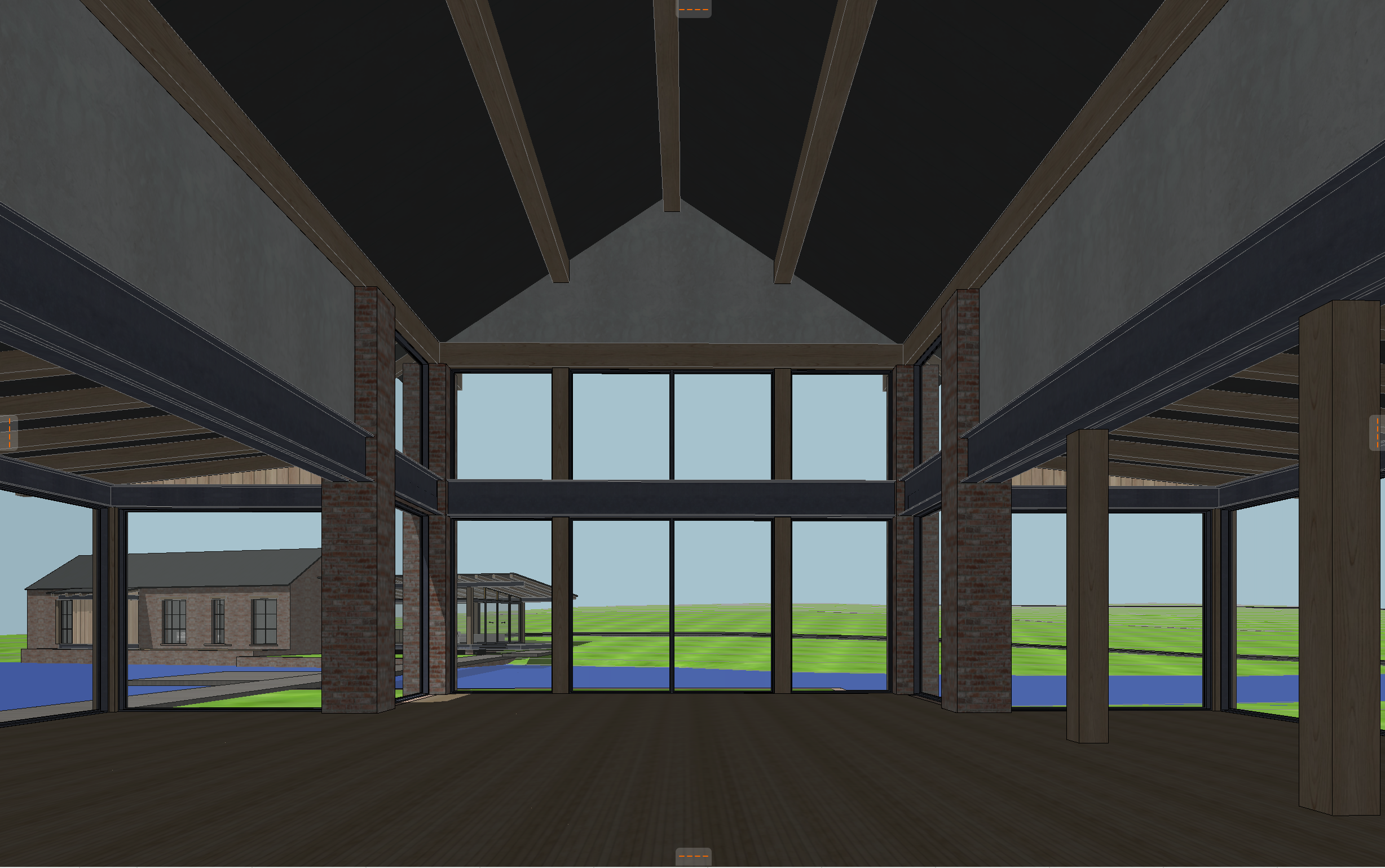 interior shot of a lodge with a massive wedding happening husband and wife to be standing together with preacher in front with rows of people in front of them with their backs facing the camera the aisle of the wedding should be in the center of the frame