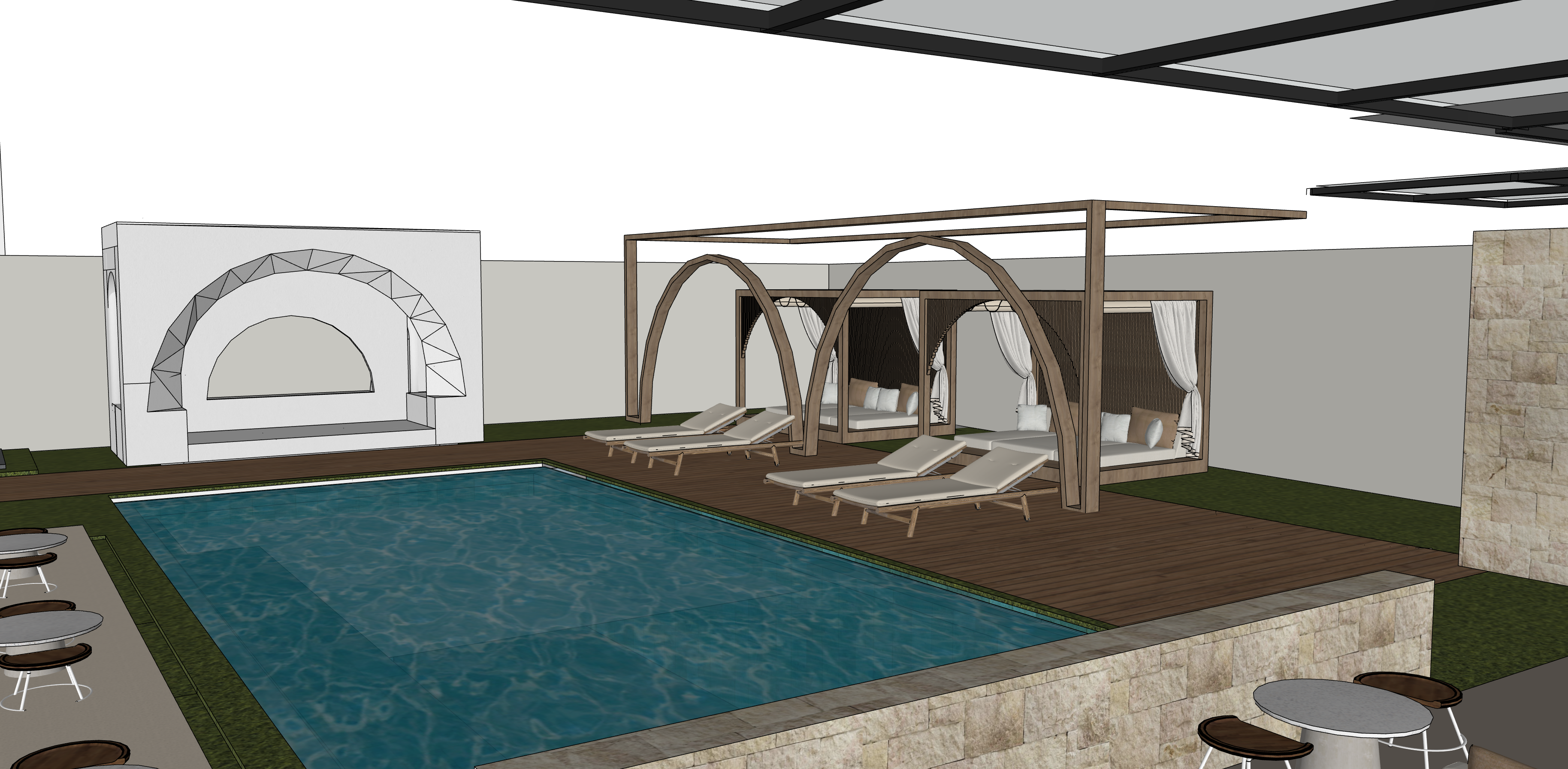 exterior shot visual of boutique hotel cafe and pool area