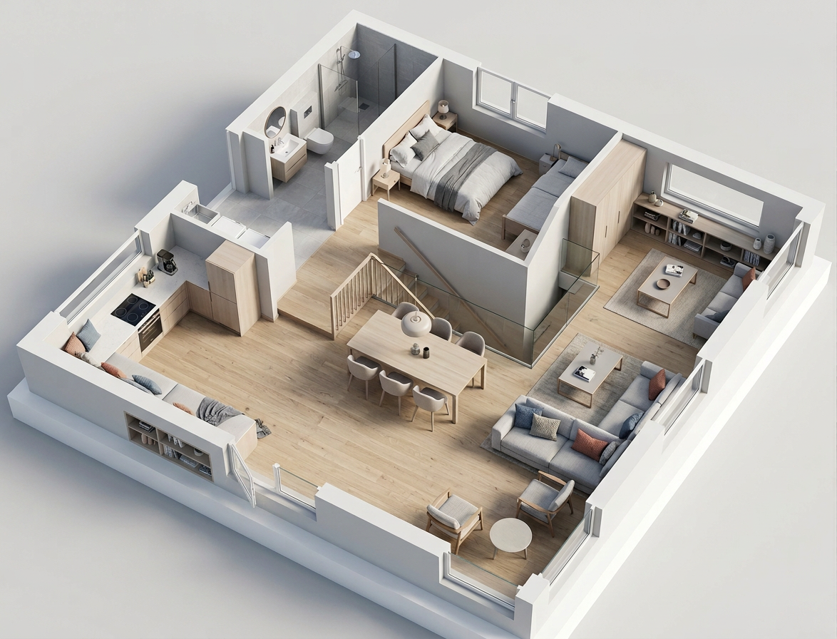 convert this floor plan into a realistic isometric 3d view of a full house show the space from an elevated angle with furniture walls and details visible jeg vil gjerne ha en 3d variant fra stuen mot kj kkenet skandinavisk stil takh yde 2 7 m ingen veggskap p kj kken f lge tegningene til punkt og prikke use the same furniture as shows on the plan do not change the orientation of the floorplan