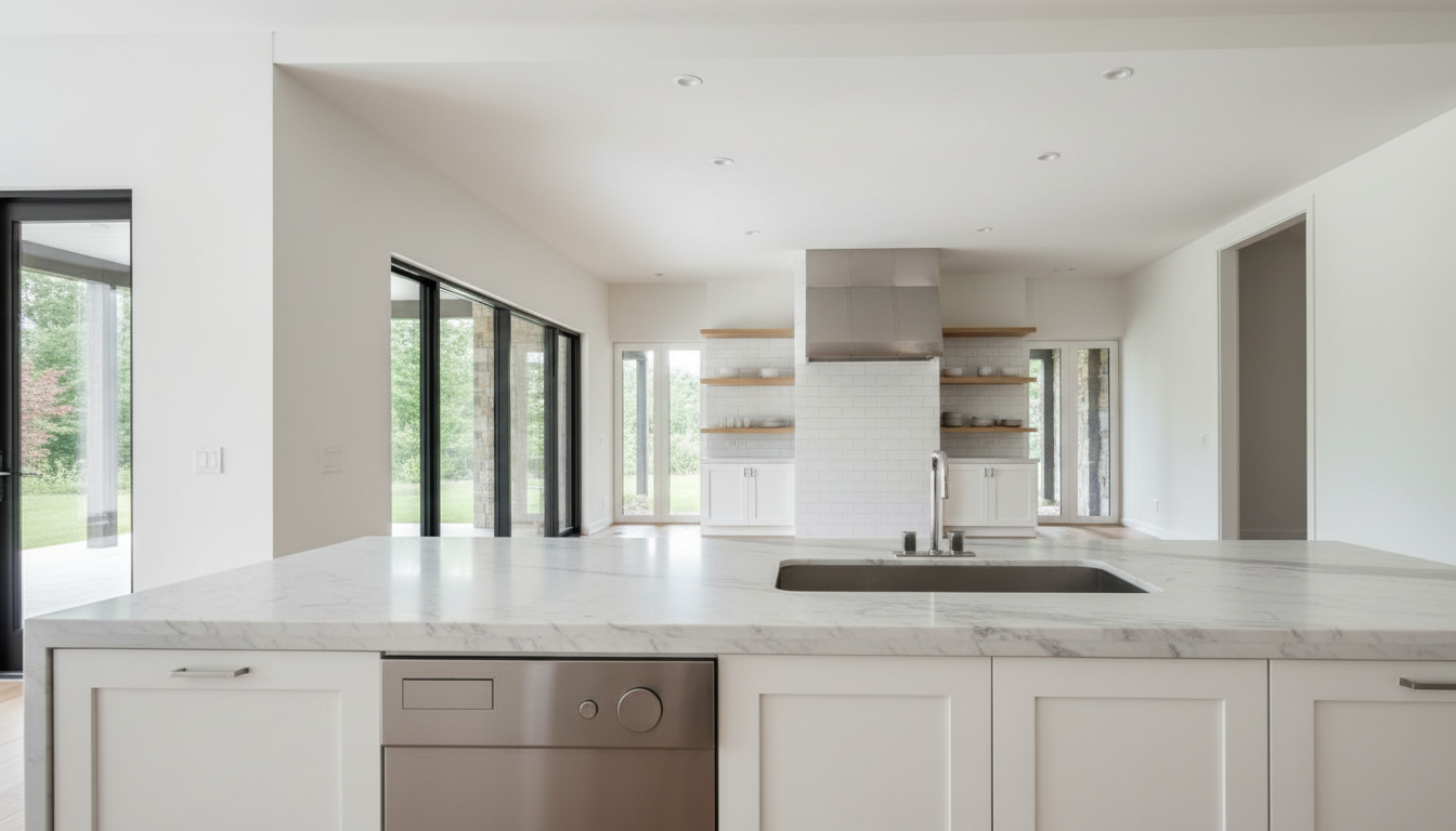 render a modern office space with a sleek minimalistic design the walls are textured with light gray tones contrasted by deep blue panels serving as accent features long rows of contemporary workstations with dual tone desks in dark brown and black support sleek computers each showing a vibrant sunset image black ergonomic office chairs add a touch of elegance the atmosphere is calm and professional enhanced by soft ambient lighting from the white ceiling the overall color scheme incorporates muted grays rich blues and classic browns conveying a sophisticated and productive environment