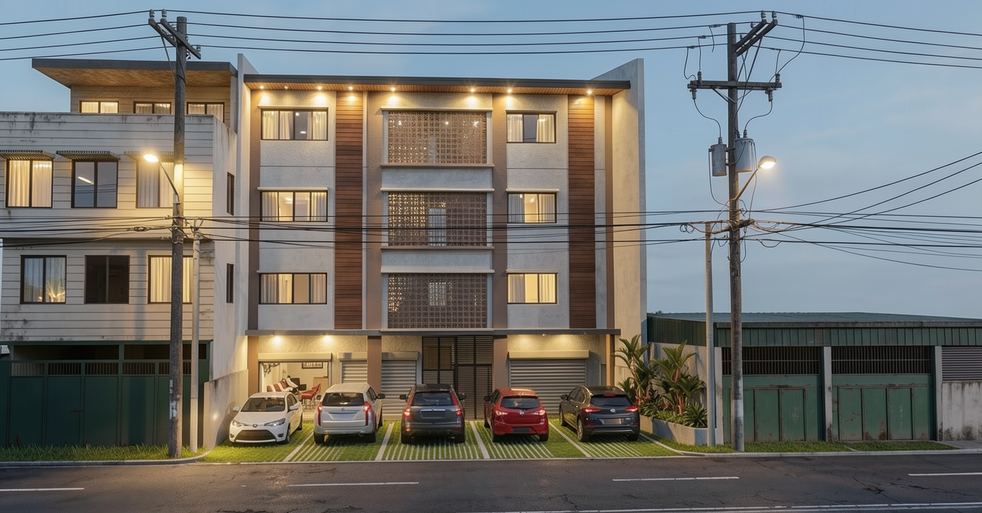 make the parking floor pavers add lighting at the window canopies remolve the rectangle like window inside the middle of the 2nd and 3rd floor make the lighting a bit muted