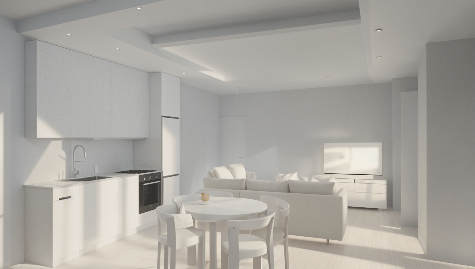 the left side of the render should be the same as the reference photo including the table and the seating and the lights on the ceiling while in the wardrobe section in the middle place led lights inside the closet and put some clothes but don t change anything else so the ambient light should also match the reference photo and should be bright and have a 4000k light