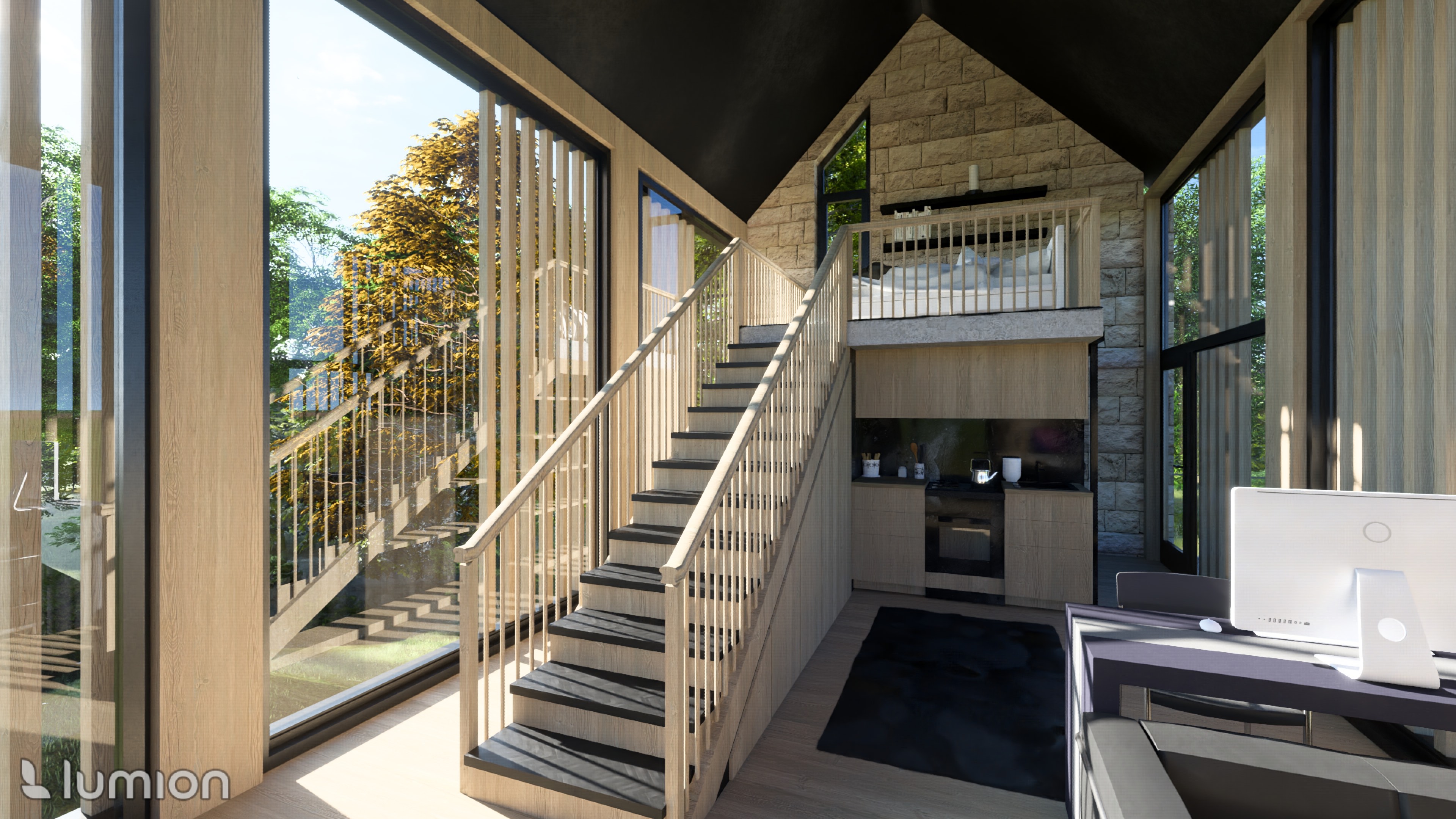 interior shot tiny house in portugal with natural stone facade and elements of wood