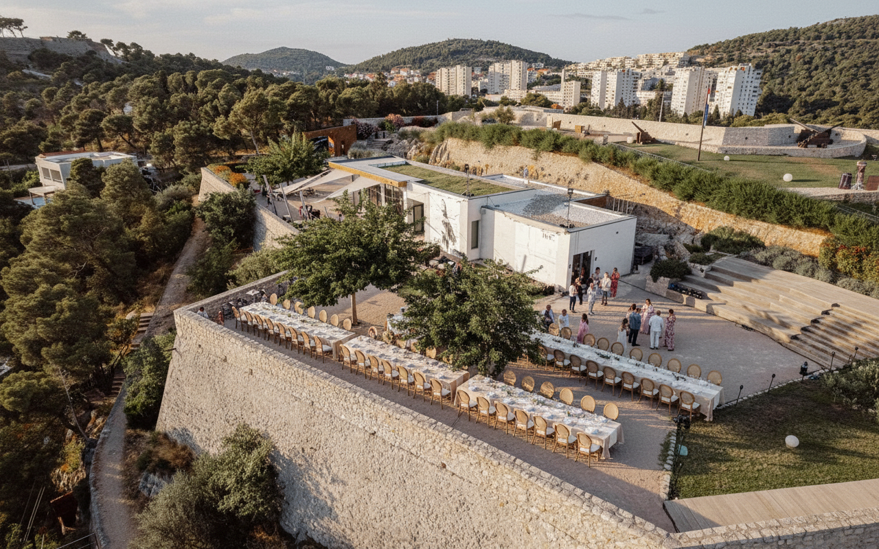 make long tables with chairs as much as you can firt and lounge and cocktails around