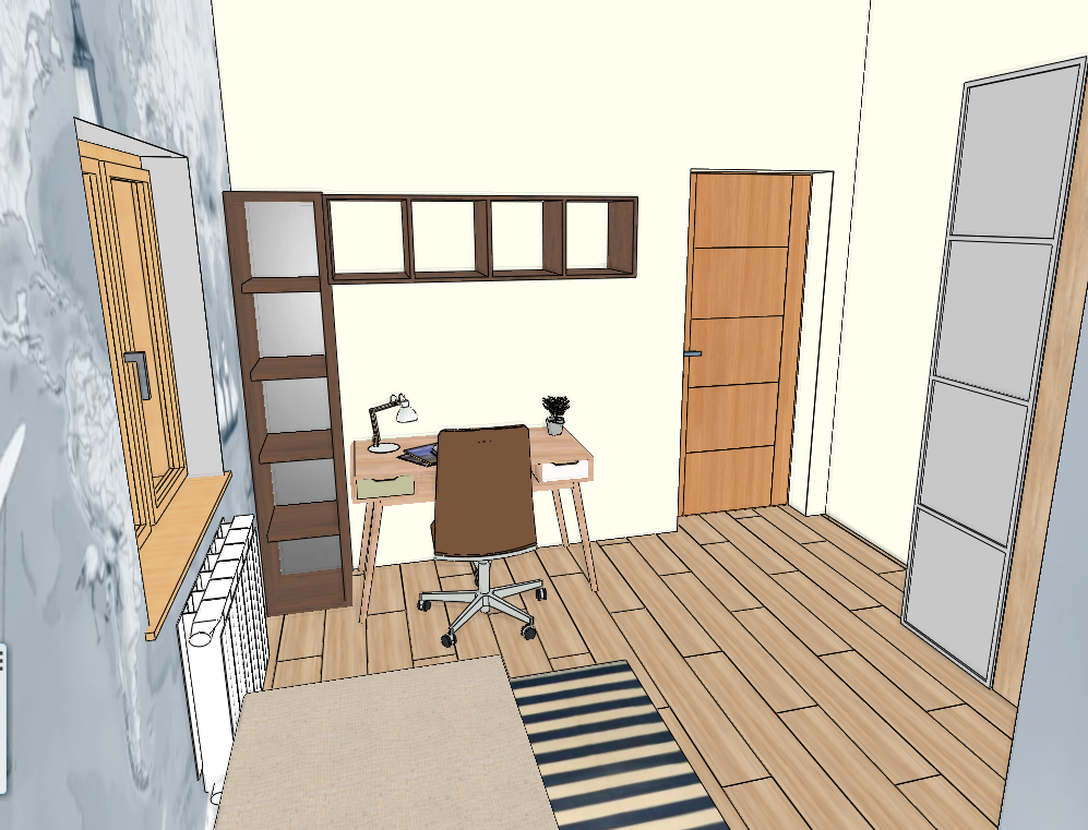 children s room atmosphere friendly soft the outside light is not strong the parquet is medium brown oak on the left side of the wall around the window there is cloudy wallpaper the wall is medium brown where there is no wallpaper opposite there are shelves around the desk on the sides and above put some games books a lamp on them the door has a brown wood pattern the front of the wardrobe is frosted glass and wood the carpet under the bed is striped with nice blue and pale beige stripes there is a beige blanket on the bed