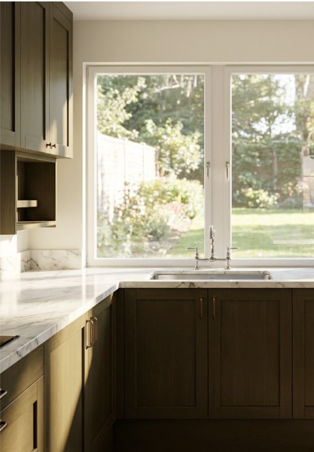 create just one single width large blockout roman blind folded and covering third of the height of the window in natural linen look
