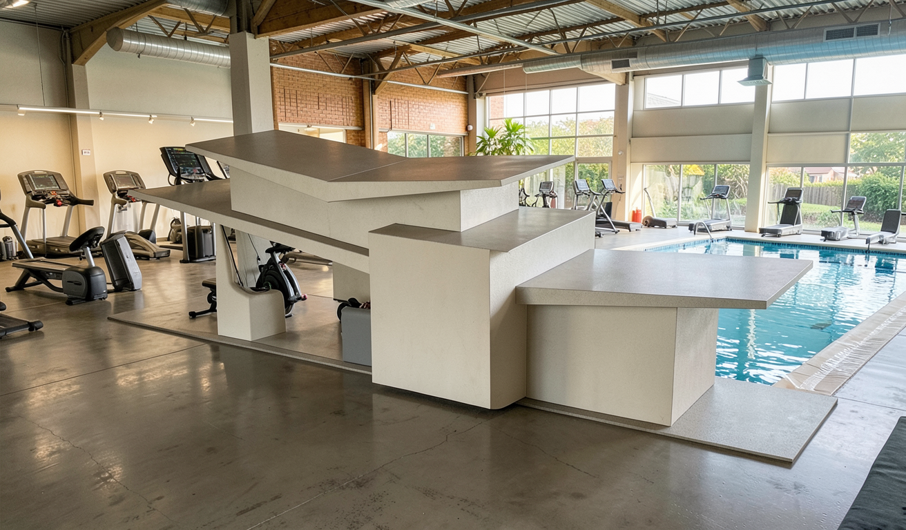 large open family living space designed as a sunrise salon filled with warm early morning natural light entering from large windows bright sculptural ceiling and calm architectural envelope warm light toned wood or stone flooring open family kitchen integrated along one wall with a large island a cozy corner breakfast banquette near the windows and a generous l shaped sectional sofa forming a relaxed lounge zone facing a large wall mounted tv color palette inspired by sunrise with soft tones of warm peach blush pale terracotta warm beige and light golden accents textiles and upholstery adding warmth and softness spacious layout with generous circulation and furniture scaled appropriately to the large architectural volume bright welcoming contemporary family environment ultra wide architectural rendering emphasizing light comfort and openness