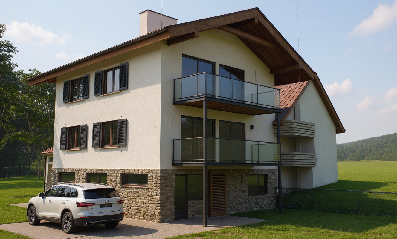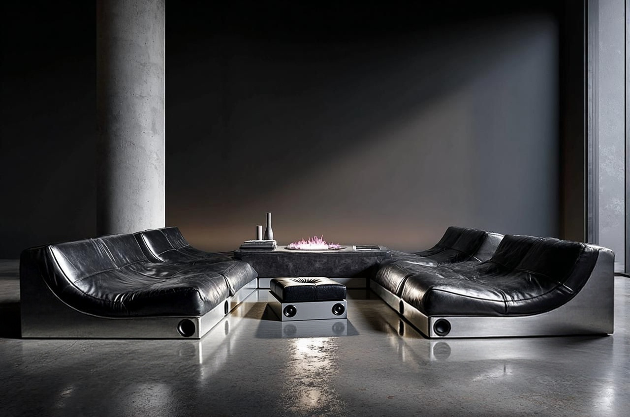 exterior shot a modular sofa made from thick textured black nappa leather with a stainless steel base with integrated speakers the stainless steel base is thick with integrated speakers the corners of the backrest of each module spike upwards photographed in a studio with concrete floors and grey concrete walls the sofa modules are arranged in a u shape facing each other cinematic feel photographed with a hasselblad h6d 400c soft shadow fall off styled interior shot luxury feel