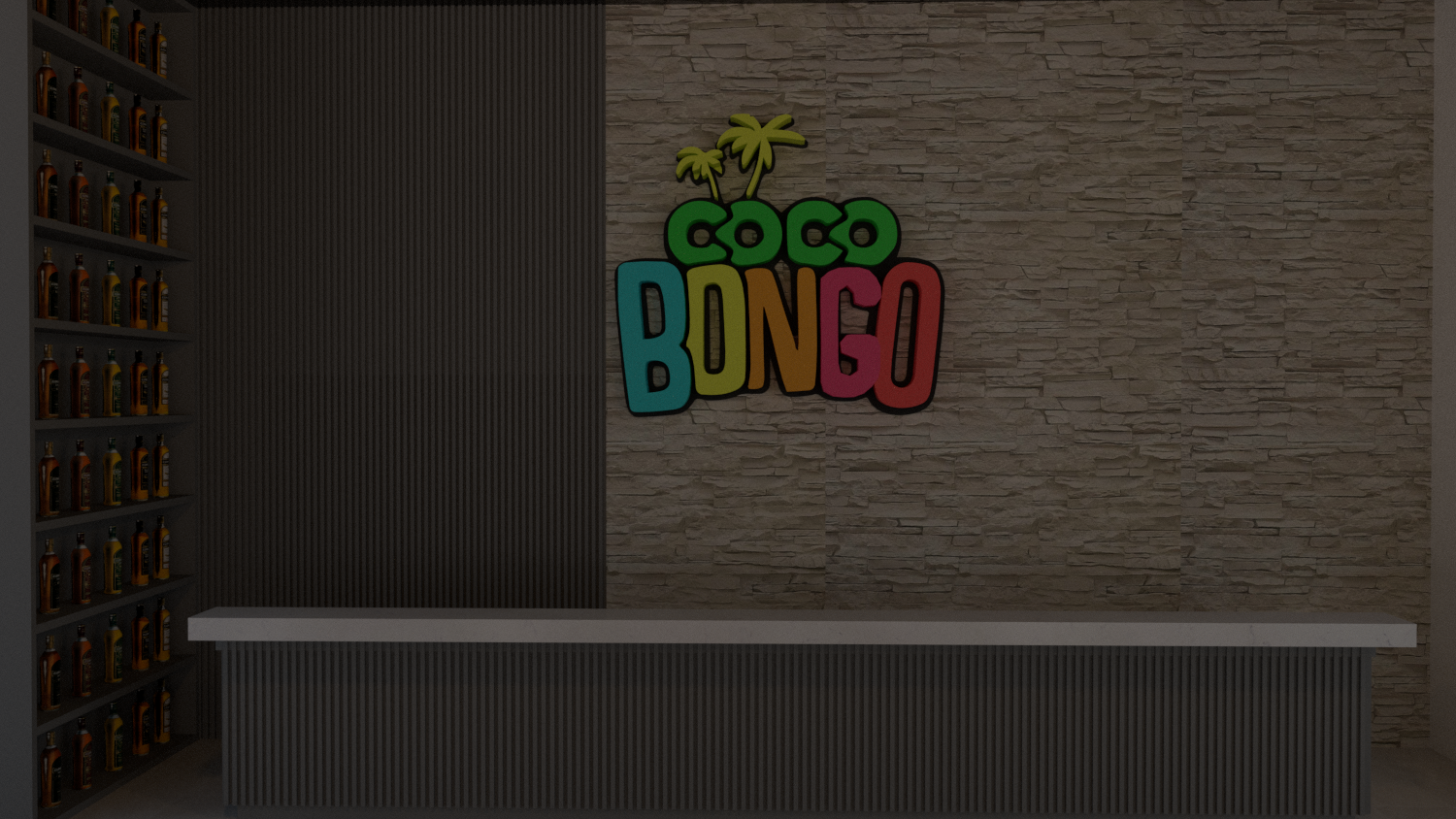 negocio con barra de lambrin y marmol fondo de lambrin y piedra laja con repisas llenas de botellas iluminacion led madera chocolate