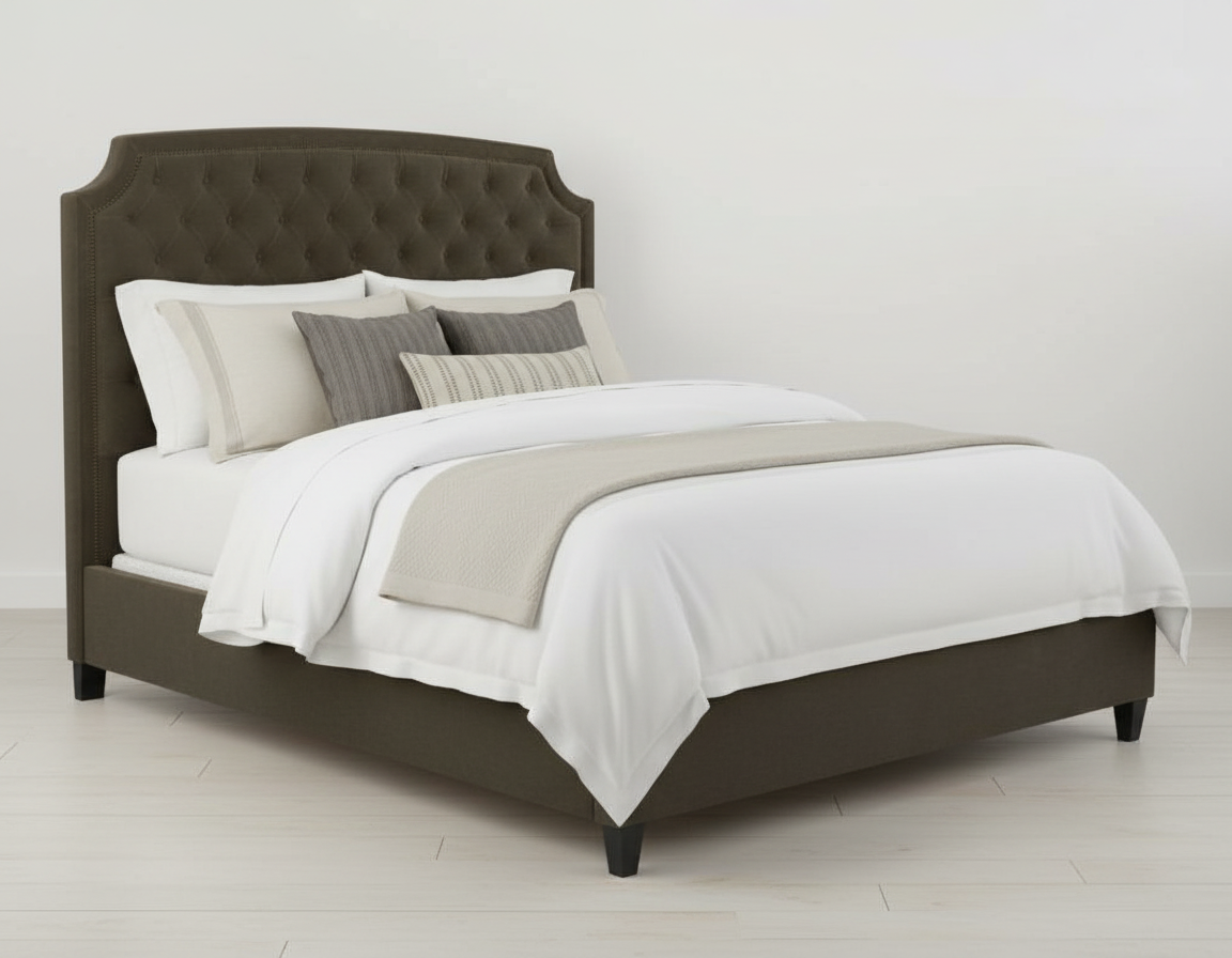 update the pillows to be more of all white and beige update the legs of the bed to be a turned style leg