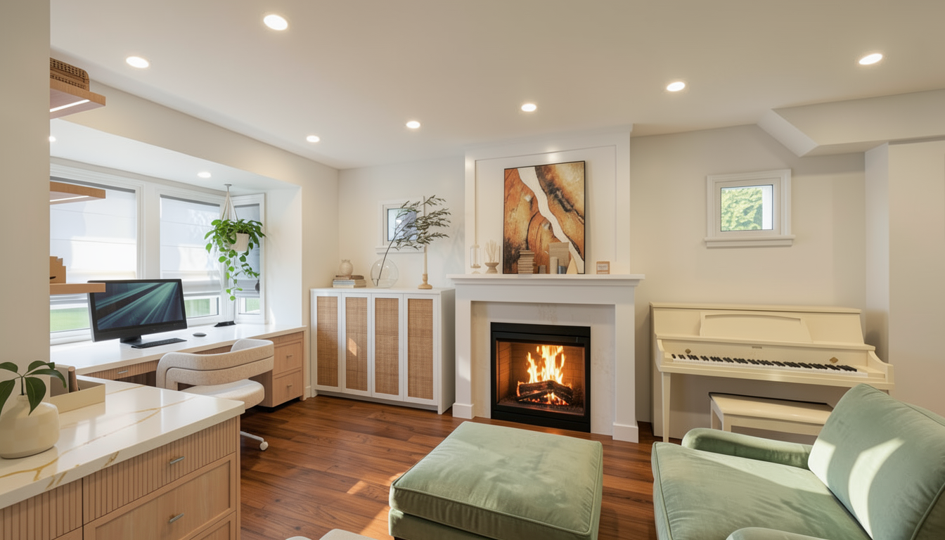 add one bartender behind the bar preparing drinks and interacting naturally while preserving the bar s structure and alignment stools should appear upholstered in brown leather with subtle natural sheen and cushioned tactile texture include executive guests seated at the bar add premium alcohol bottles arranged tastefully to bar shelves keep all materials as they are