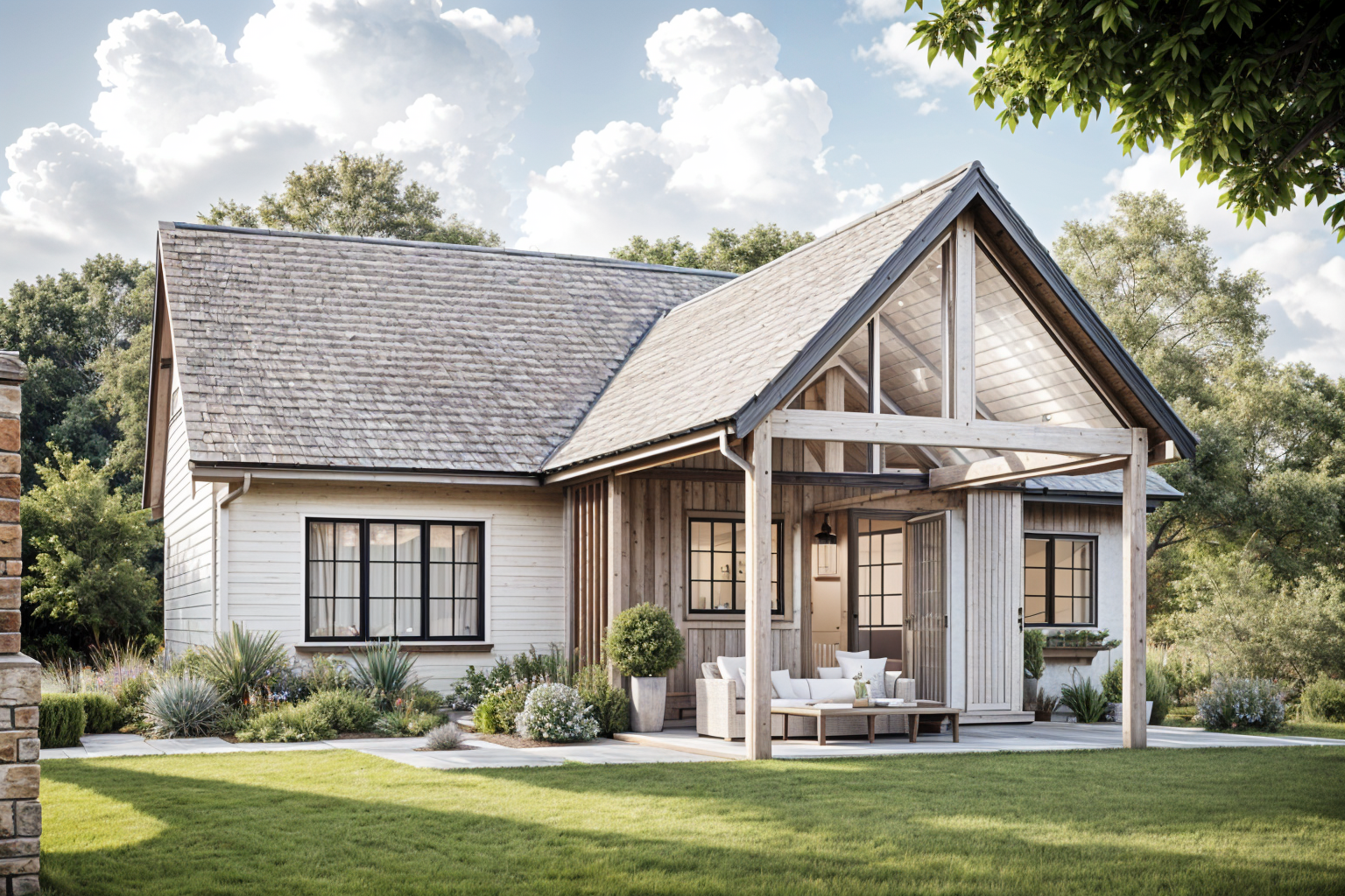 create a stunning architectural visual depict a modern pavilion with intricate wooden lattice arches using rich golden brown tones the surrounding buildings should be sleek with a minimalist design in off white and light grey hues the ground is paved with light grey stones alongside a reflective pool of water capturing a serene atmosphere the sky is clear and soft blue with natural daylight enhancing the overall composition architecture