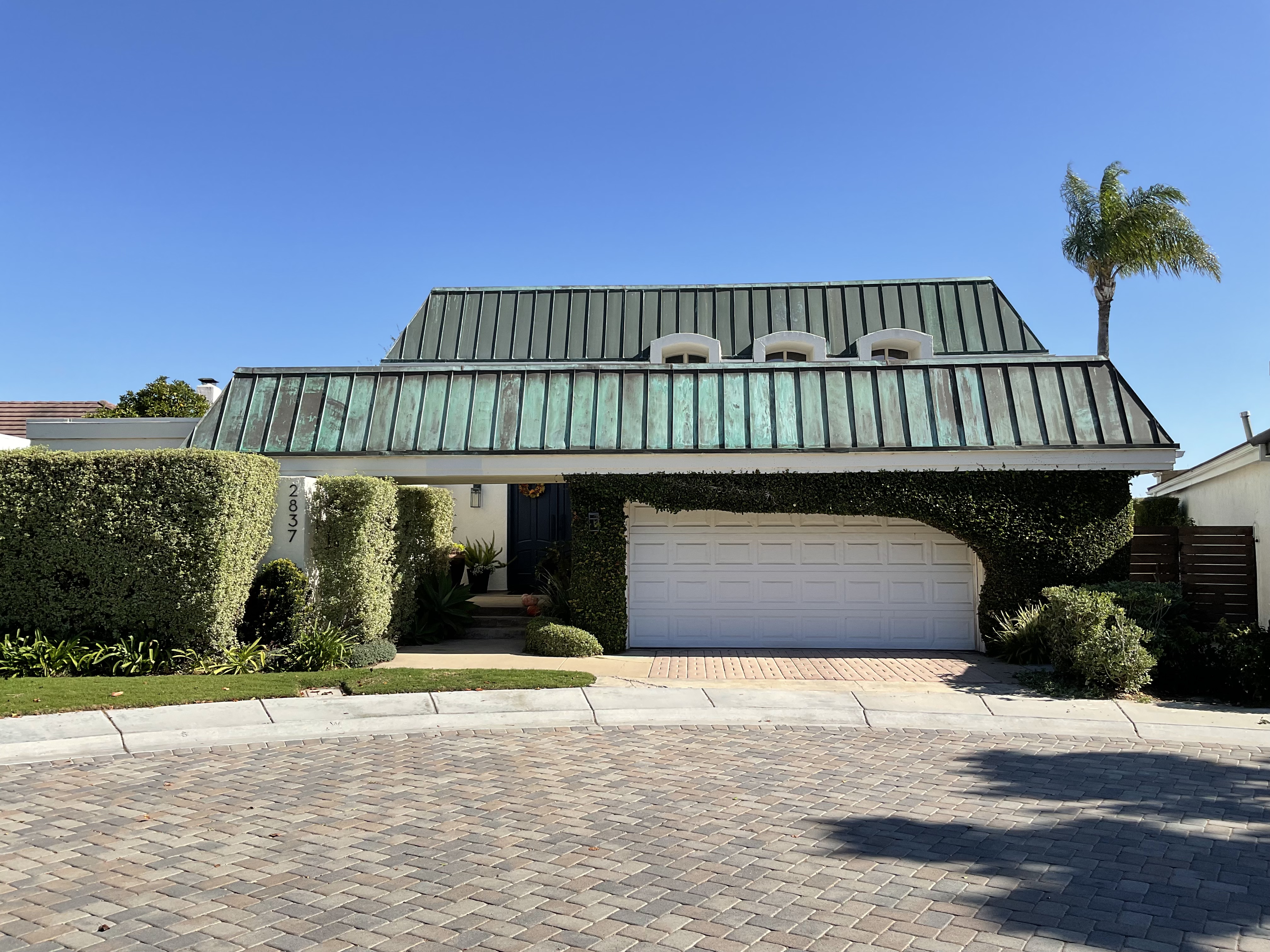 change the exterior to santa barbara stucco in a warm off white remove all hedges shrubs and greenery existing change the rooftop to a dark bronze
