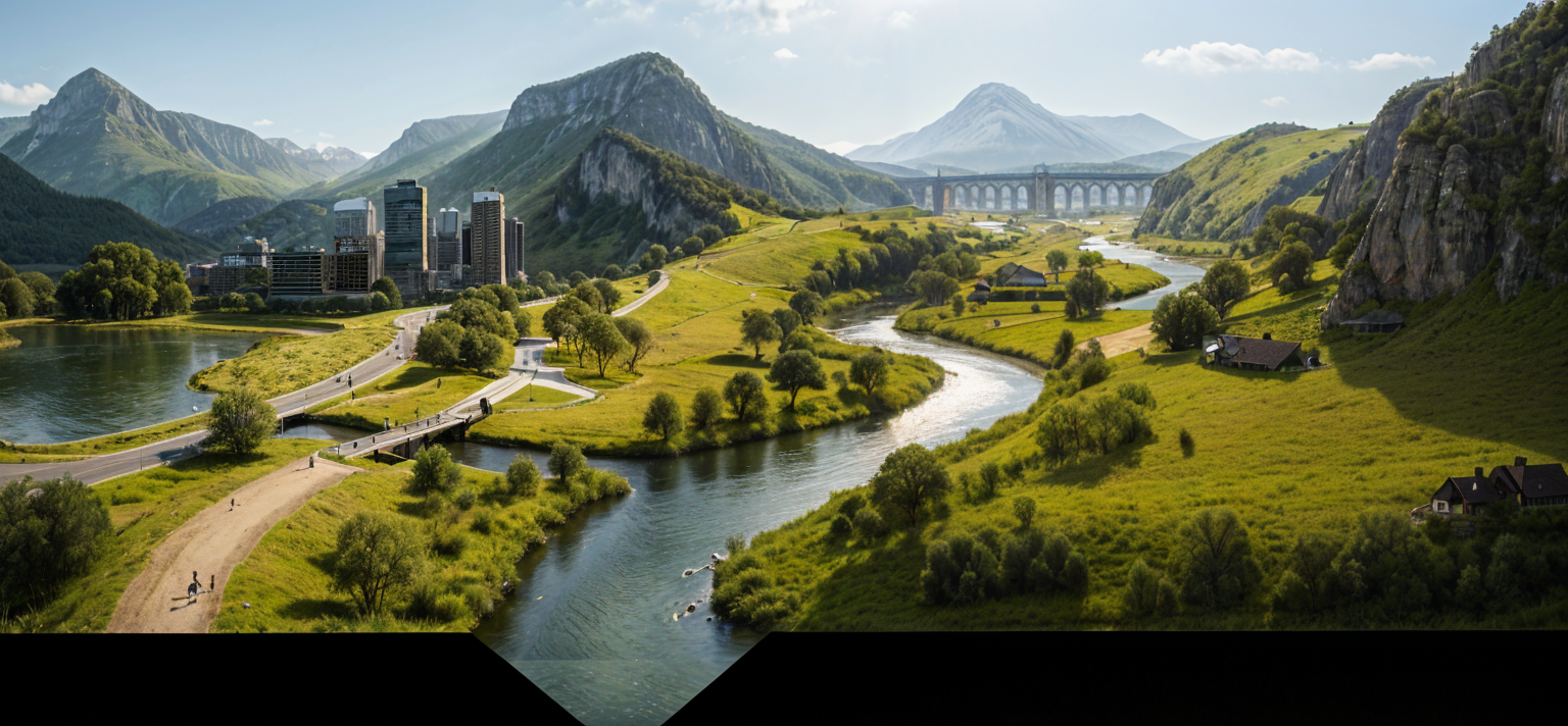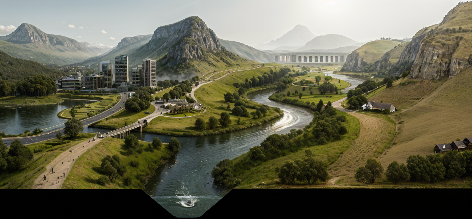 exterior shot soft architectural collage atmosphere white washed sky pale desaturated tones matte finish subtle grain and paper texture soft fog glow light bloom around trees and horizon gentle vignette calm poetic landscape minimal contrast soft edges nordic competition board aesthetic airy composition territorial river valley riparian vegetation elegant and institutional mood no flowers no ornamental gardens no houses no vibrant color no cartoon look no hard realism architecture