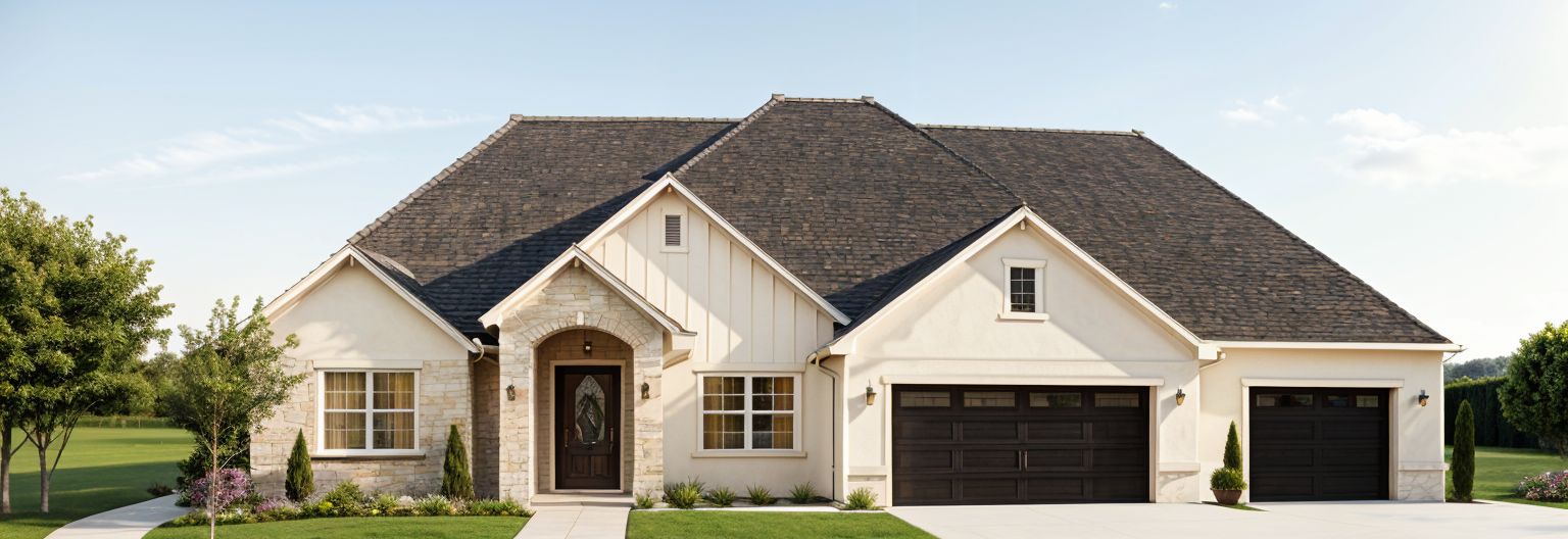 keep everything exactly the same same lighting camera angle textures and realism extend the stone material all the way up on the two car garage wall and on the leftmost wall under the far left window so the stone reaches full height extend the board and batten siding all the way up on the single car garage far right and on the wall to the right of the front porch where it currently stops halfway do not change any other materials colors or lighting maintain the same quality and photo realism
