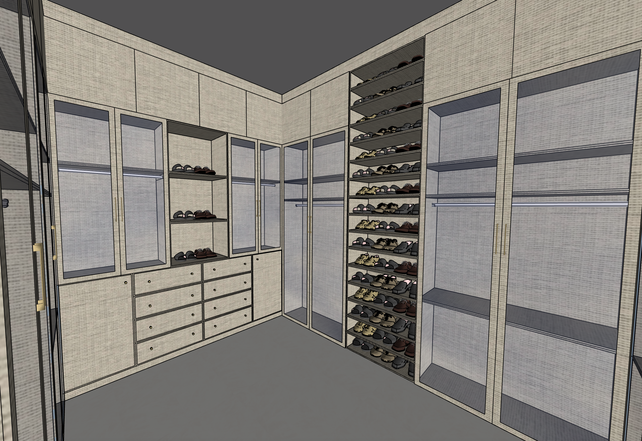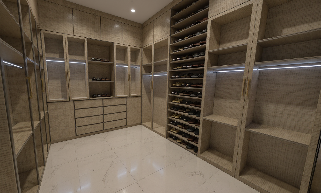 render a luxurious walk in closet featuring sleek modern cabinetry with a light beige finish incorporate glass doors with subtle reflections creating a sense of openness highlight shoes arranged in an elegant organized manner on shelves use warm ambient lighting to evoke a cozy and inviting atmosphere the floor should be a smooth matte ivory tile add brass handles for a touch of sophistication the overall vibe should be elegant and serene with a focus on luxury and organization