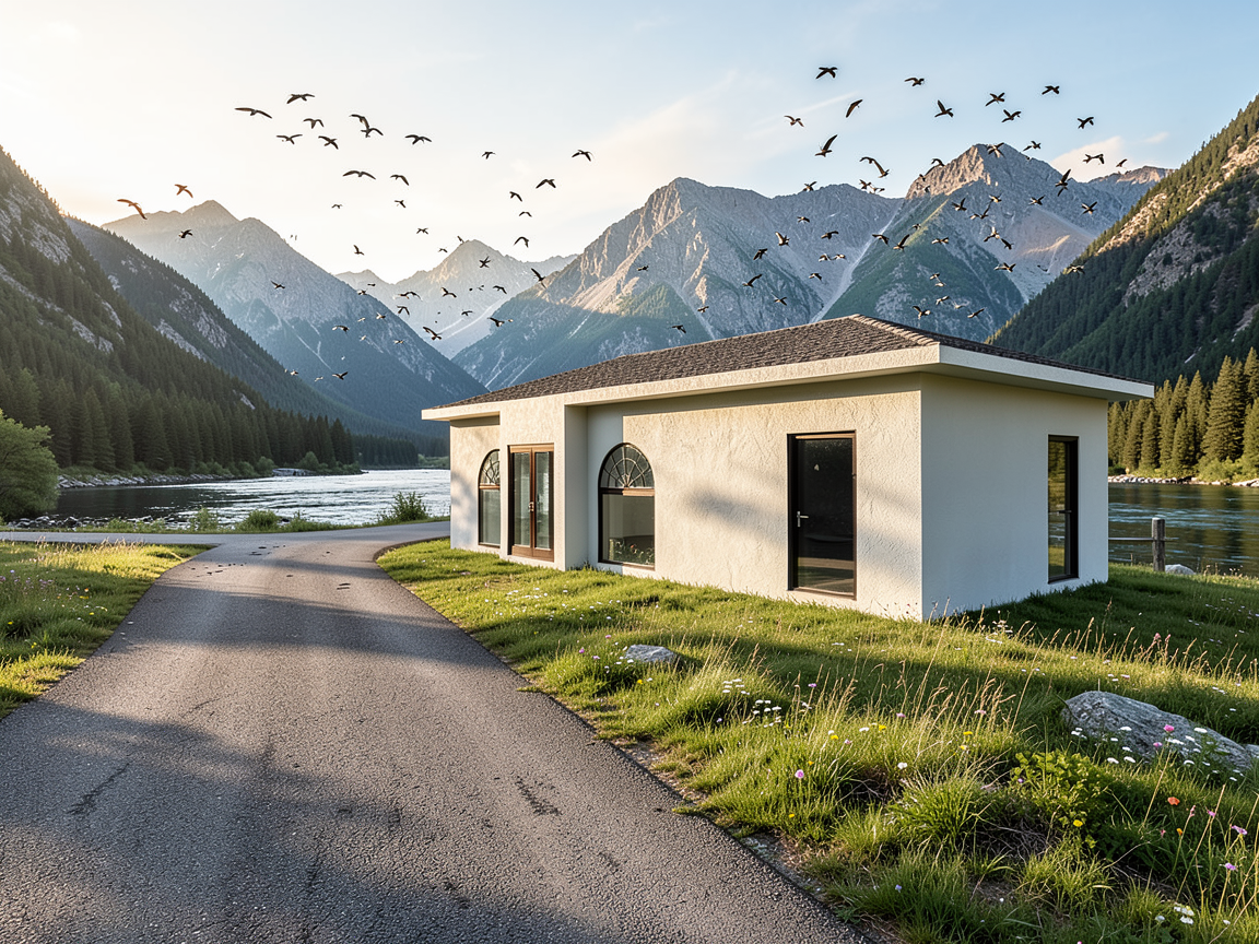 make house look realistic forest around the house window glass to be more opaque concrete driveway to be on the right side of the house grey finish on house is wood vertical siding