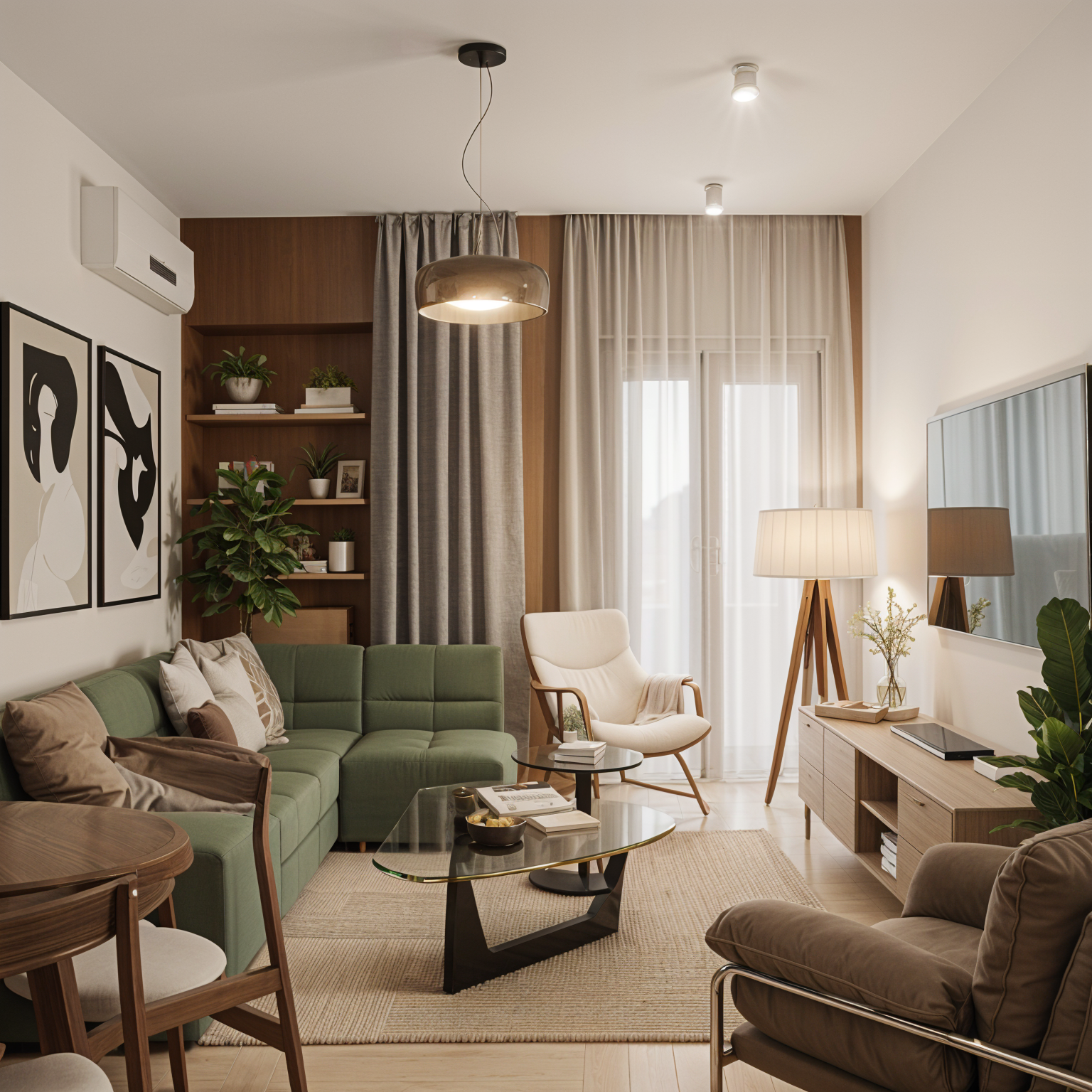 make it summer afternoon in japan outside the windows close the curtains but make them transucent turn on the floor lamp in the color k3000 add led light coming out from behind the wooden panel from top and from the side dimmes to 50 k3000 every suraface is mate except the mirror add a white siberian cat walking blurred out tv is turned of and make it black and mate close the curtains but make them translucent befind the floor pouff that is not a window but a slim mirror that goes from the floor up