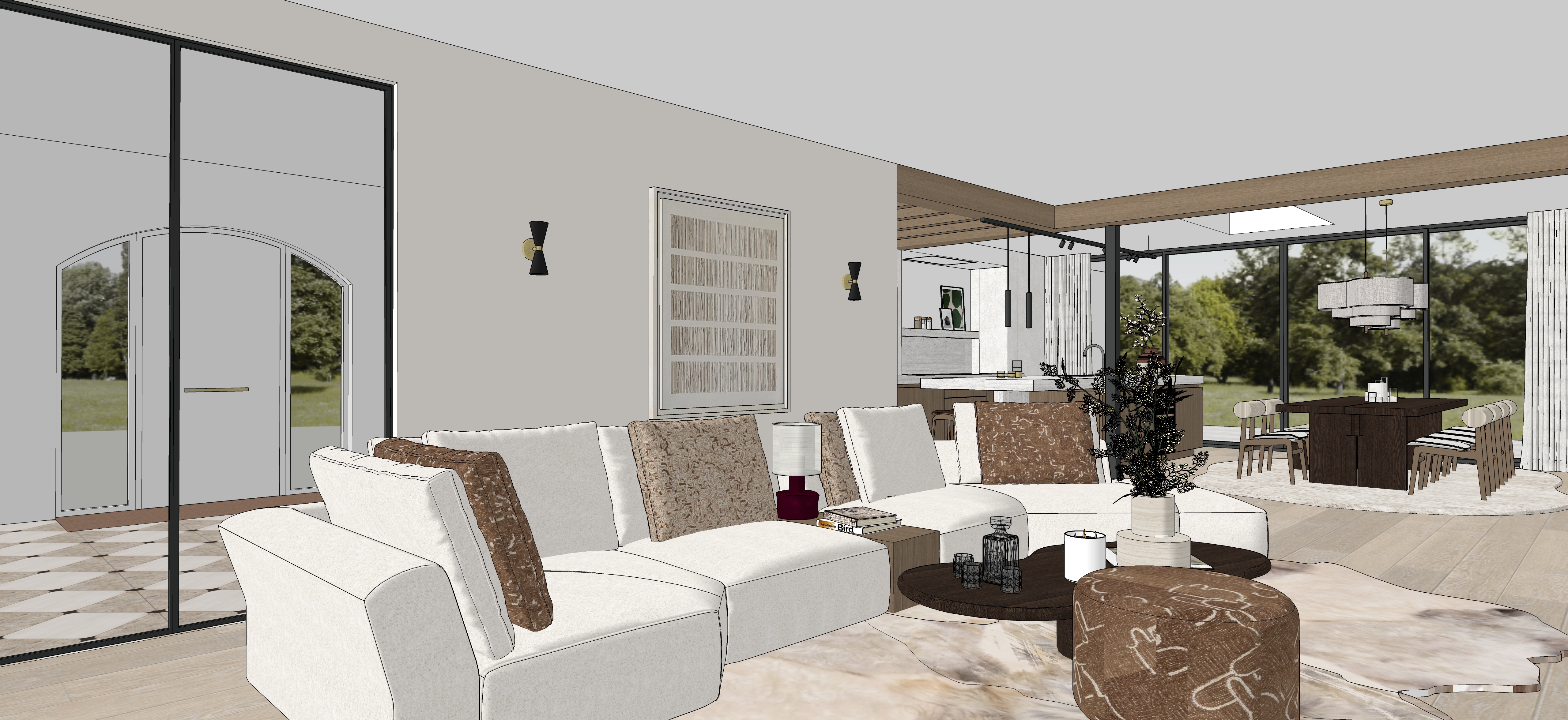 create an ultra high end 4k ultra photorealistic architectural interior render based strictly on the uploaded reference image using the exact same viewpoint this is an existing interior design that must be treated as a camera matched architectural backplate and must match the previously rendered scenes of the same project in style materials lighting and overall visual language the complete spatial layout architectural structure wall positions ceiling geometry exposed wooden ceiling beams black steel beam and column skylight position kitchen island cabinetry layout dining table living room furniture placement window and door positions glass double doors proportions and circulation must remain one hundred percent identical to the reference image no redesign no reinterpretation and no repositioning of any element is allowed no interior elements may be added or removed the camera position height angle framing and crop must match the reference image exactly the camera must behave like an architectural photography lens with a two point perspective equivalent to a 24 to 28 mm focal length all verticals must be perfectly vertical without distortion the entire image must be ultra sharp with crisp micro detail across the whole frame no depth of field blur haze fog or bloom is allowed all walls and tall kitchen cabinets must be finished in beige microtopping or lime plaster kalkverf with a matte mineral texture subtle tonal variation and visible plaster depth the tall cabinets must visually blend into the wall planes and must not appear as wooden elements no wood grain is allowed on tall storage walls all wood elements must be finished in natural walnut wood with a warm medium brown tone visible grain pattern subtle natural variation and realistic depth walnut is allowed only on the kitchen base cabinets island cabinetry dining table coffee tables and selected furniture elements the walnut finish must be satin to matte and must never be glossy or overly dark all stone tablet surfaces shelves and countertops must be rendered in light grey to beige travertine with a natural limestone character visible pores and subtle mineral veining the finish must be satin to matte and never glossy no marble concrete or polished stone look is allowed the parquet flooring must have a natural satin to matte finish and must not appear glossy or reflective the wood grain must be visible with subtle surface relief and no plastic sheen all upholstered furniture must show soft natural fabrics with visible weave and subtle natural folds the sofa must appear soft and voluminous cushions must show gentle creasing and textile variation the rug under the coffee table must be rendered as a layered composition of multiple sheepskins stitched together with visible variation in pile height ranging from closely shorn sheepskin to longer highland style fleece the colour palette of the rug must consist of multiple soft beige tones with natural tonal variation and tactile depth the surface must not appear uniform or flat all metal elements must be finished in warm brushed bronze except for black structural steel and black wall mounted lighting fixtures which must remain black the metal finishes must show soft muted reflections without high gloss all lighting fixtures must be actively emitting light all interior lighting must be switched on and must emit warm light at a colour temperature of 2700k the black wall mounted fixtures must function as up and down wall washers casting visible light both upward and downward on the wall surfaces the pendant lighting above the dining table ceiling lighting and track lighting must be switched on and must create soft warm pools of light and visible light interaction on walls floor wood and stone surfaces one single horizontal led light line must be visible under the kitchen shelf and actively emitting warm light at 2700k no other visible led strips are allowed the artificial lighting must remain clearly visible and readable without creating strong contrast or theatrical hotspots the skylight must be clearly visible in the ceiling and must distribute soft natural daylight into the space with gentle falloff and without harsh light shafts soft morning daylight must enter only through the visible glass sliding doors and the skylight no daylight may enter from solid walls without openings the exposure must be balanced so that the interior remains light airy and readable without silhouettes washed out surfaces or overexposed windows through the glass sliding doors a natural stone terrace must be visible aligned with the interior floor level behind the terrace a lush landscaped garden must be clearly visible with organic flowing shapes layered planting natural height differences and rich variation in plant textures the planting must include ornamental grasses shrubs and small sculptural trees the garden must feel natural high end and realistic without symmetry or rigid geometry the exterior must be bright and lush but slightly exposure compressed so that interior detail remains dominant through the glass double doors the entrance hall must be visible as a continuation of the same project with consistent material language warm lighting and architectural coherence the entrance hall must be softly lit and visually connected to the living space without dominating the composition the overall colour palette must be warm soft and bright with a light airy and elegant high end residential feel the image must not appear dark moody or cinematic the contrast must be soft and natural with gentle tonal transitions and open midtones no crushed blacks no heavy vignetting and no dramatic shadow contrast is allowed the glass must be ultra clear with subtle realistic reflections all interior and exterior views through glass must remain sharp and readable without fog haze or overexposure the following elements are strictly forbidden cinematic lighting moody atmosphere cgi look game engine look flat lighting blur haze fog bl