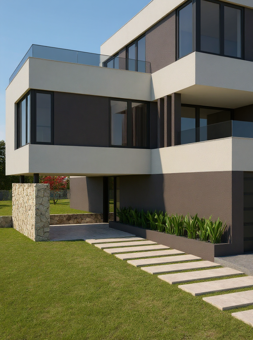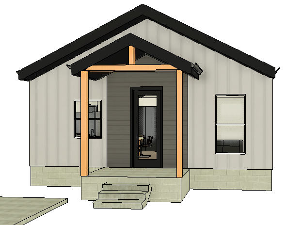 make the exterior smart siding board and batten all vertical in the color alabaster by sherwin williams for the lap siding only under the front porch by the front door use iron ore add landscaping as if the house was in a neighborhood keep the windows white keep the block foundation all raw concrete change the front door to a craftsman style 1 lite over 2 panel in the dark gray color add black gooseneck lights to either side of the front door