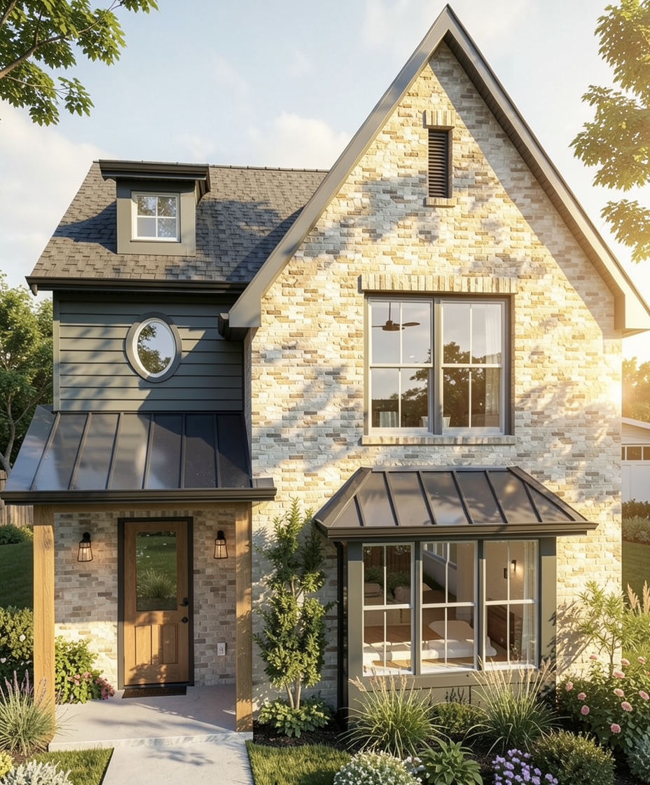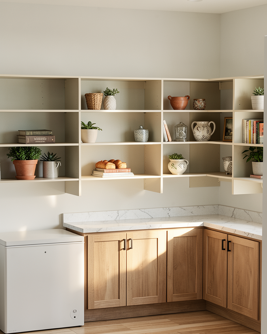 render this with light wood cabinets lighter marble countertops a mirror and vanity lights and a fun colorful full wall niche in the shower