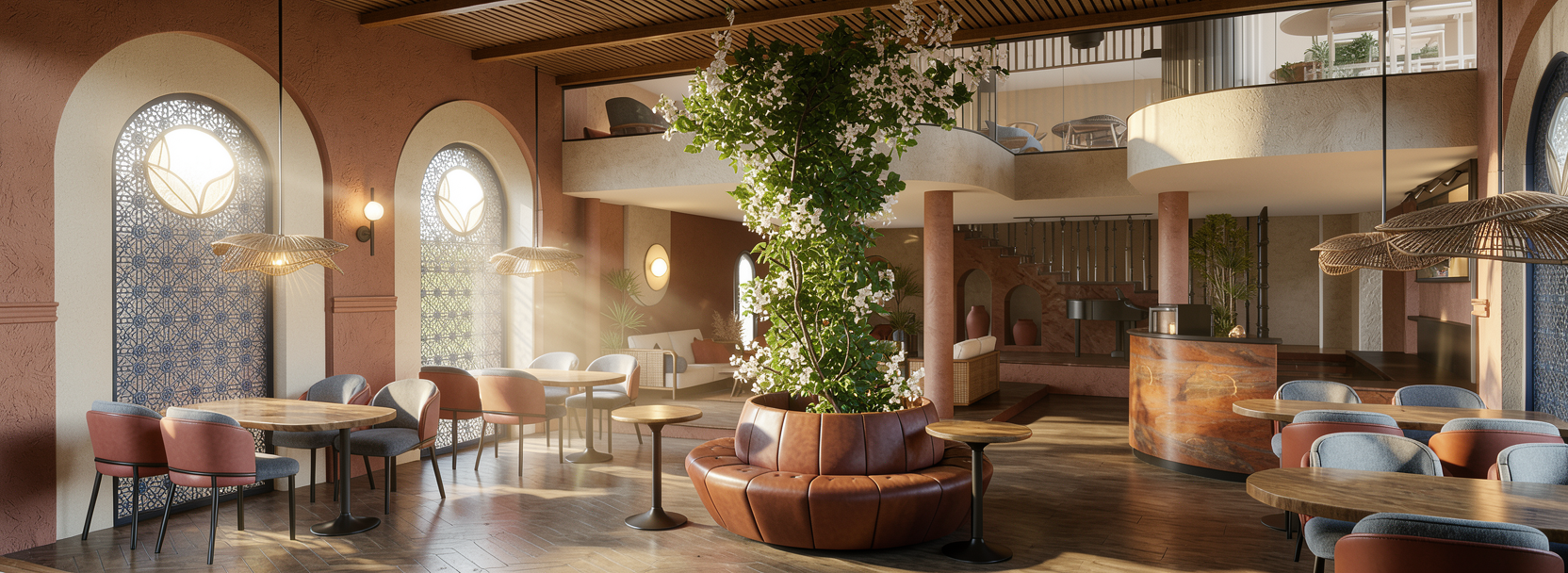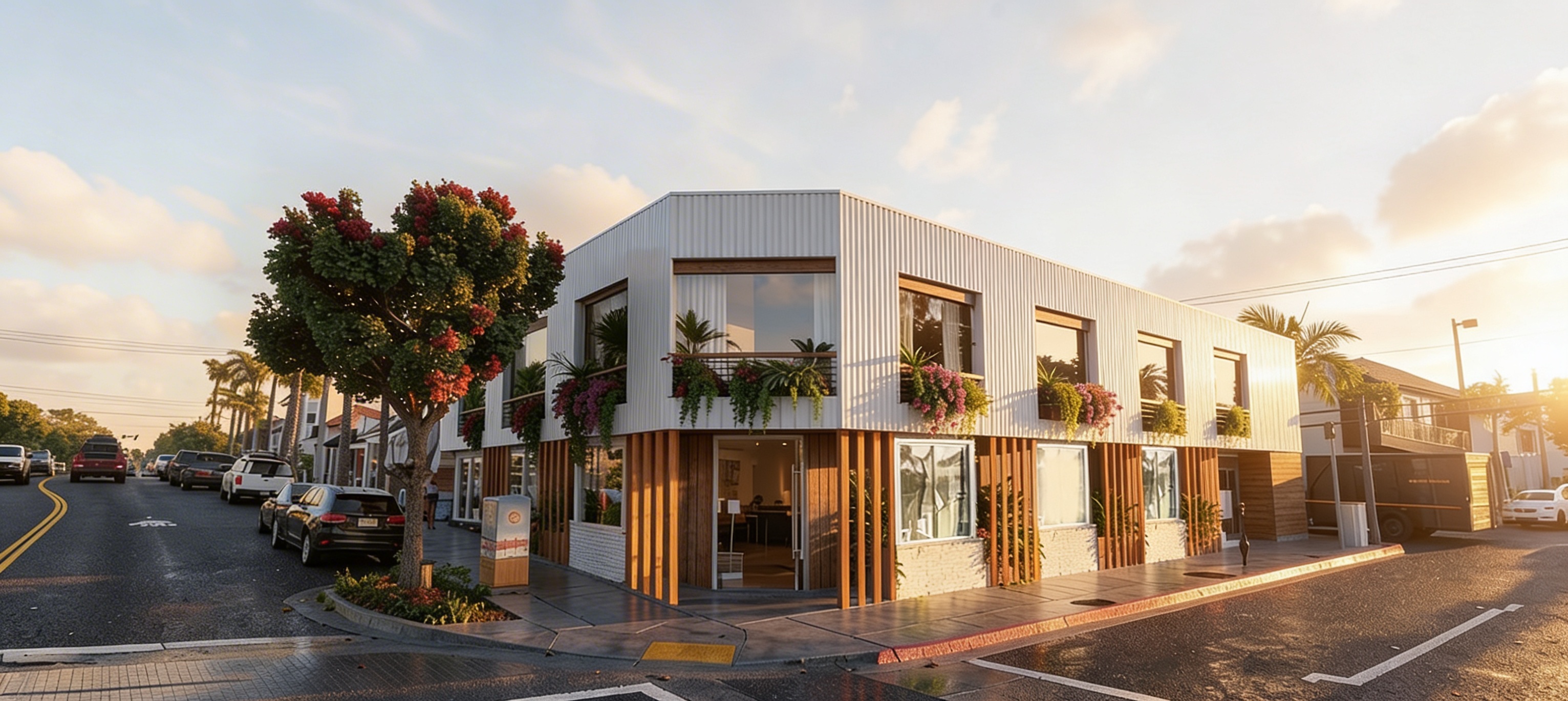 add some parking in the back make it look like its in miami and add an interactive outdoor space in front of the building
