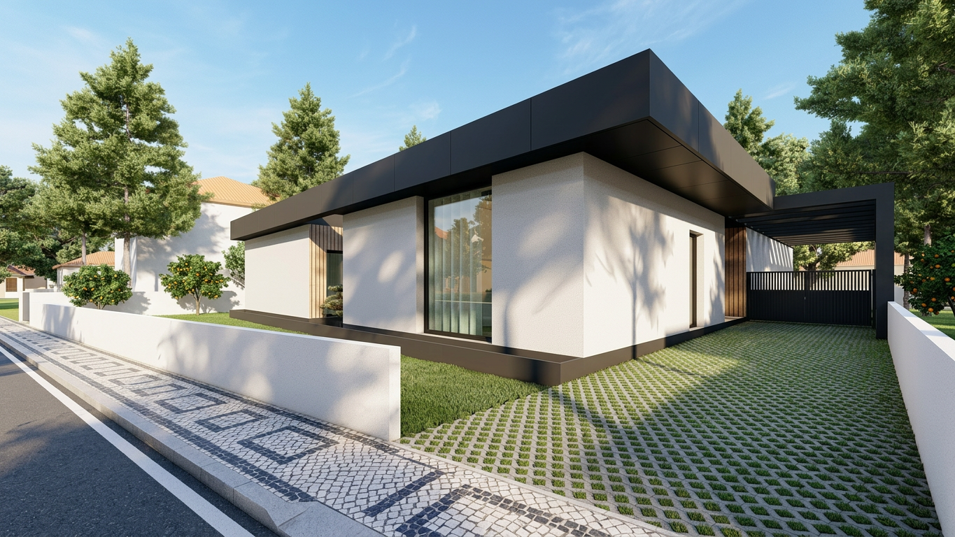 cena exterior observador esta do outro lado da rua com temos os materiais de asfalta cal ada portuguesa muro a cor branca ilimuna o natural com sol brilhando na janela de vidro sombra das arvores repleti na casa e no chao relva verde e macia vaos com vidro e caixilharias na cor preta parede a cor branco coroamento da residencia a cor preta antracite inserida no meio urbano de casas com estilo mediterraneo vegeta o sao pinheiros e larajeiras