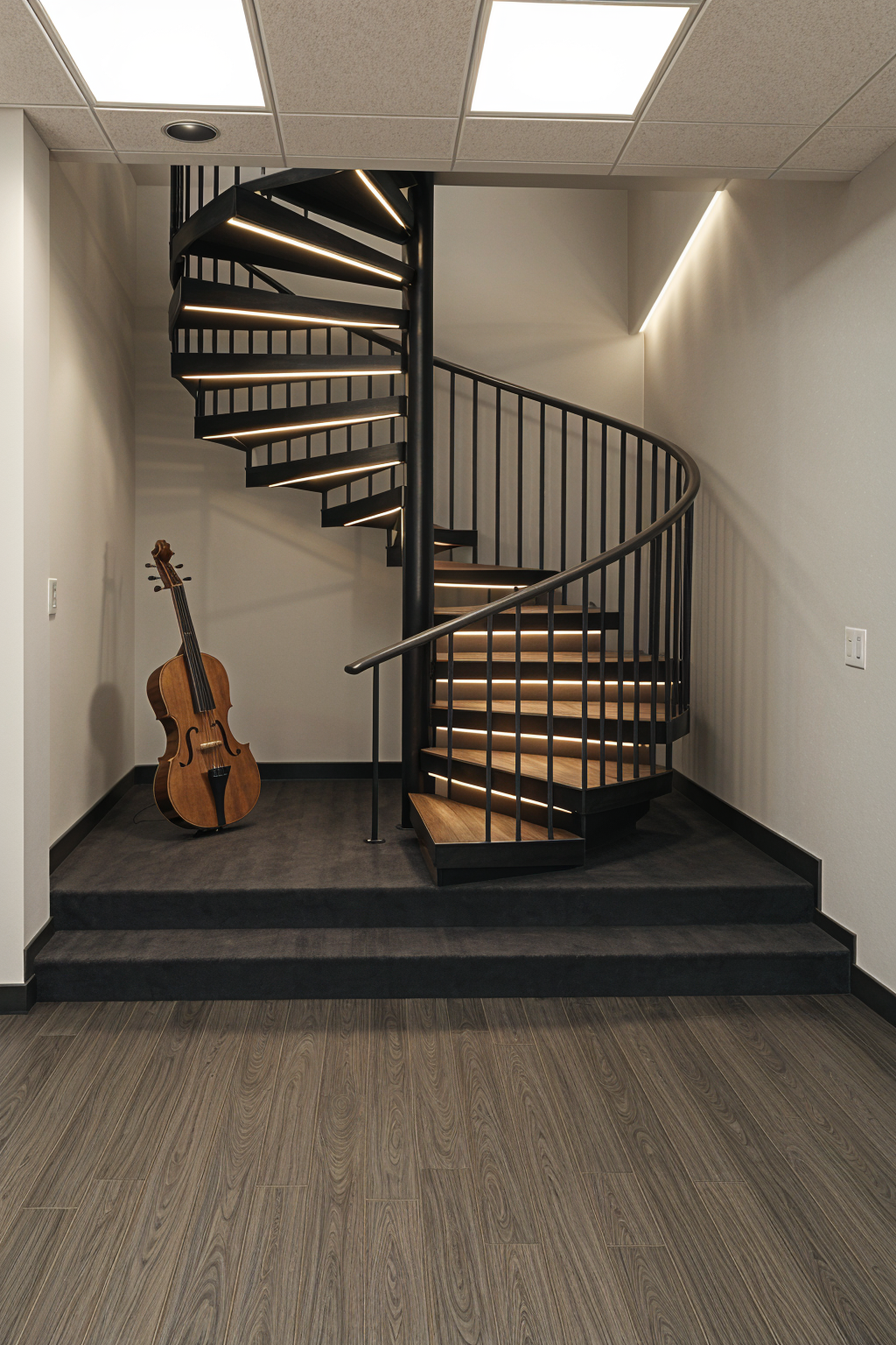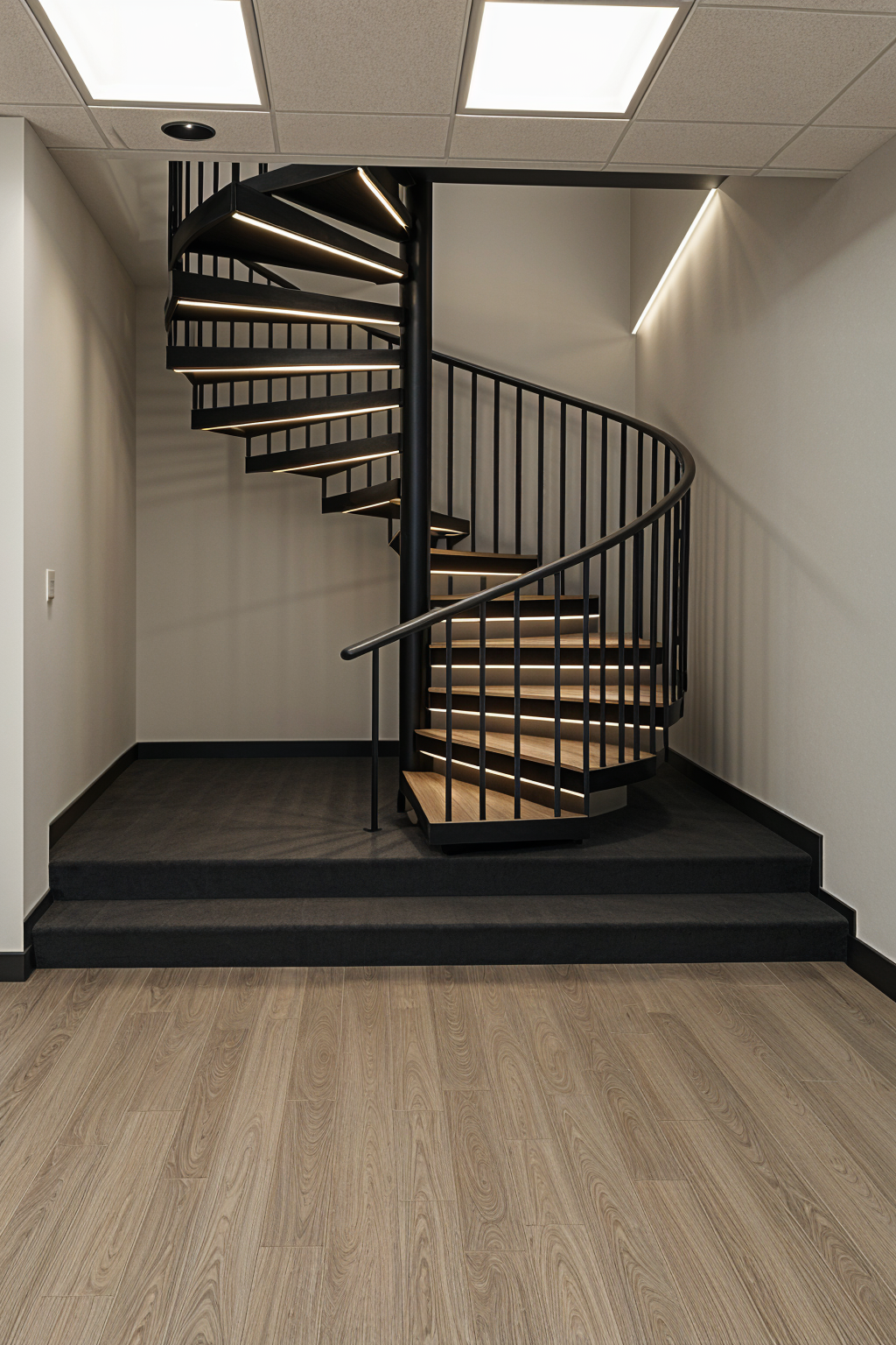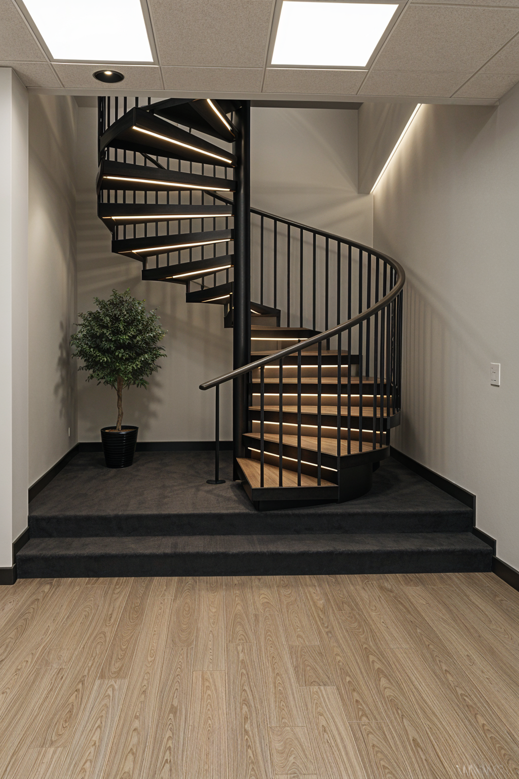 exterior shot can you create a photorealistic render of this image and turn it into a pilates studio interior using the attached mood board image for reference all lighting is to be indirect led strip lighting with some pendant lights in the corner a warm trendy minimalist style