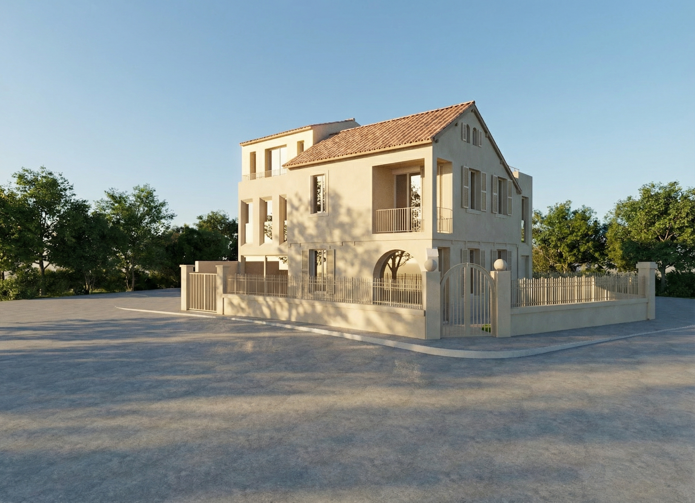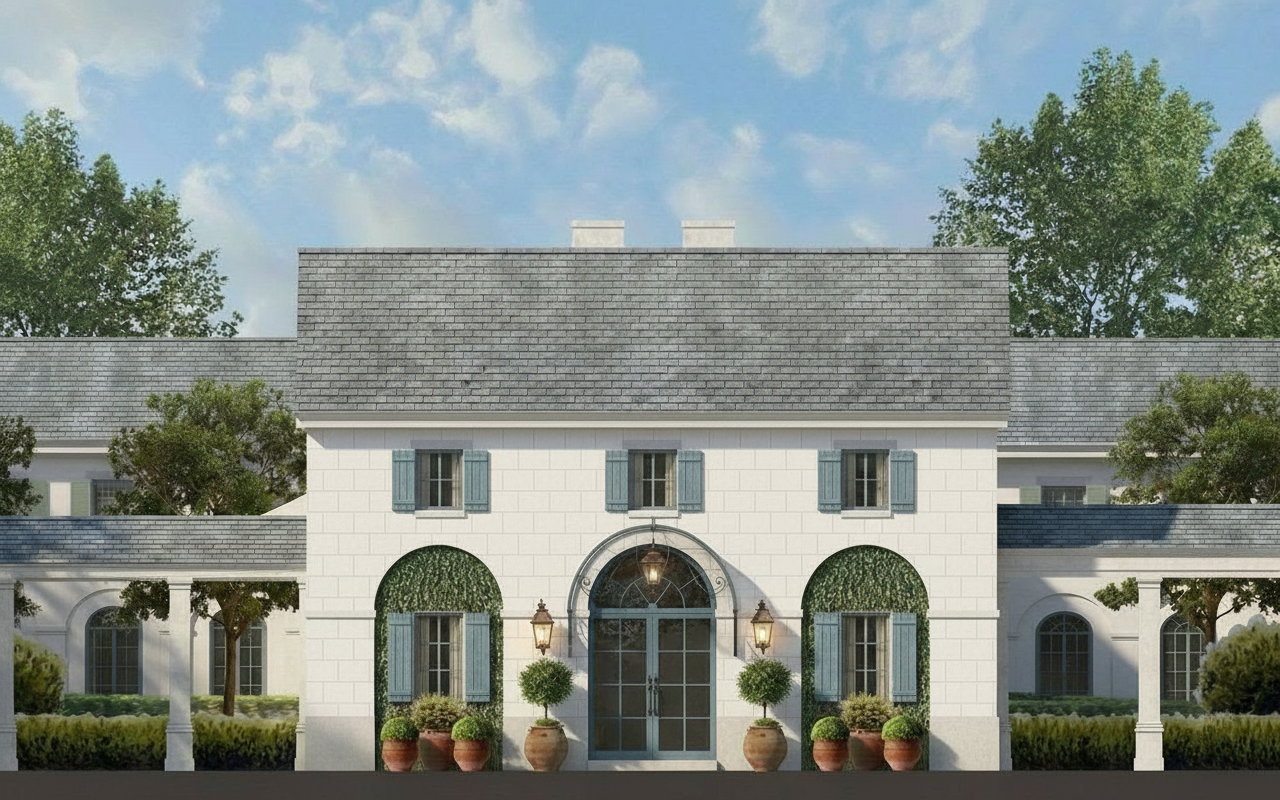 exterior shot keep the architectural integrity of the original image intact use the material finishes of the second image as inspiration