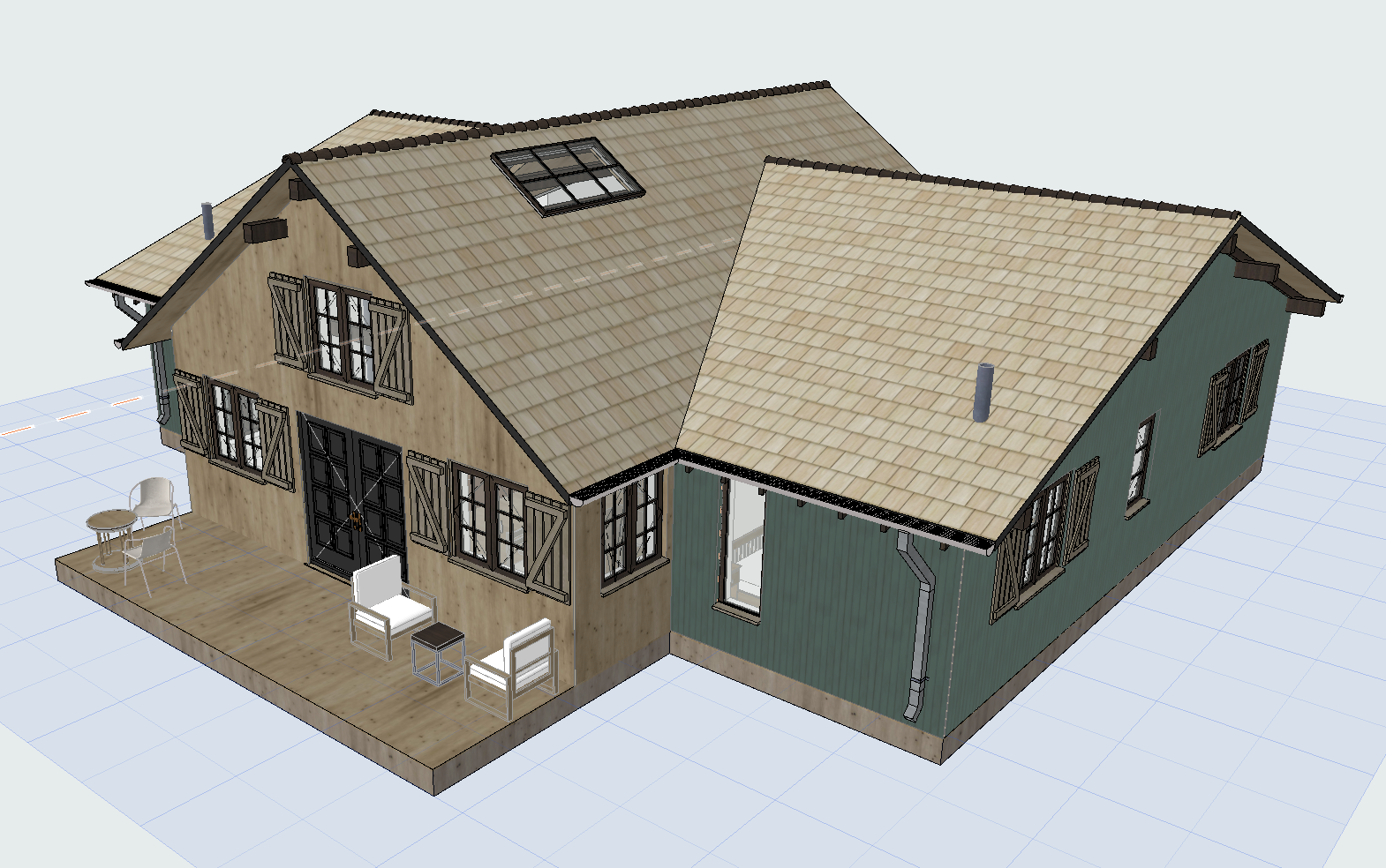 render a rustic house with a warm inviting atmosphere the walls are a rich dark brown wood accented with green corrugate metal corten on the side walls with a wooden roof textured shingle tiles windows have light wooden shutters and black frames and the front door is a deep black the porch is decorated with light wooden flooring the overall mood is cozy and serene highlighting the harmony between nature and architecture under a clear blue sky with soft diffused sunlight and mountains and big trees and pines