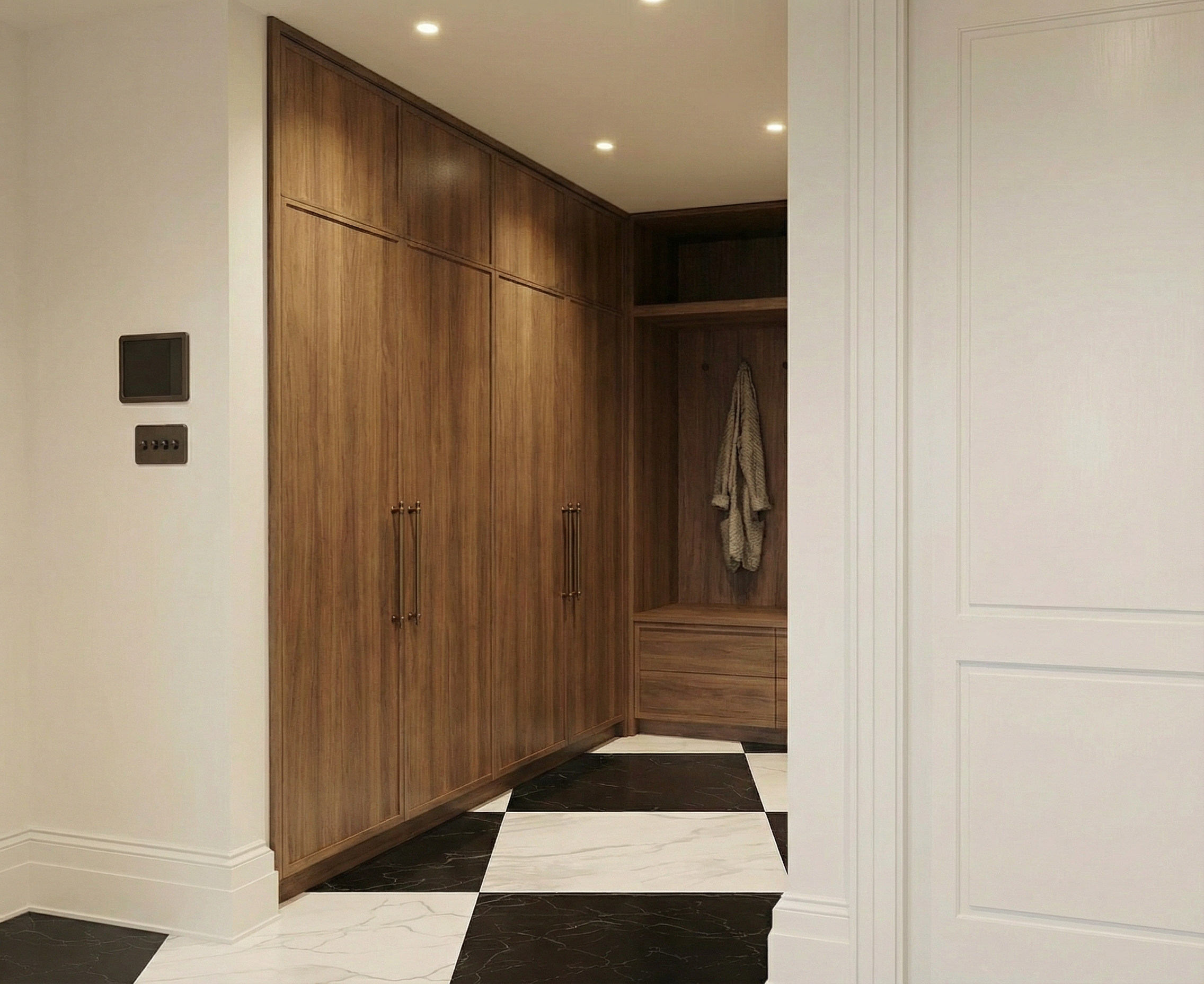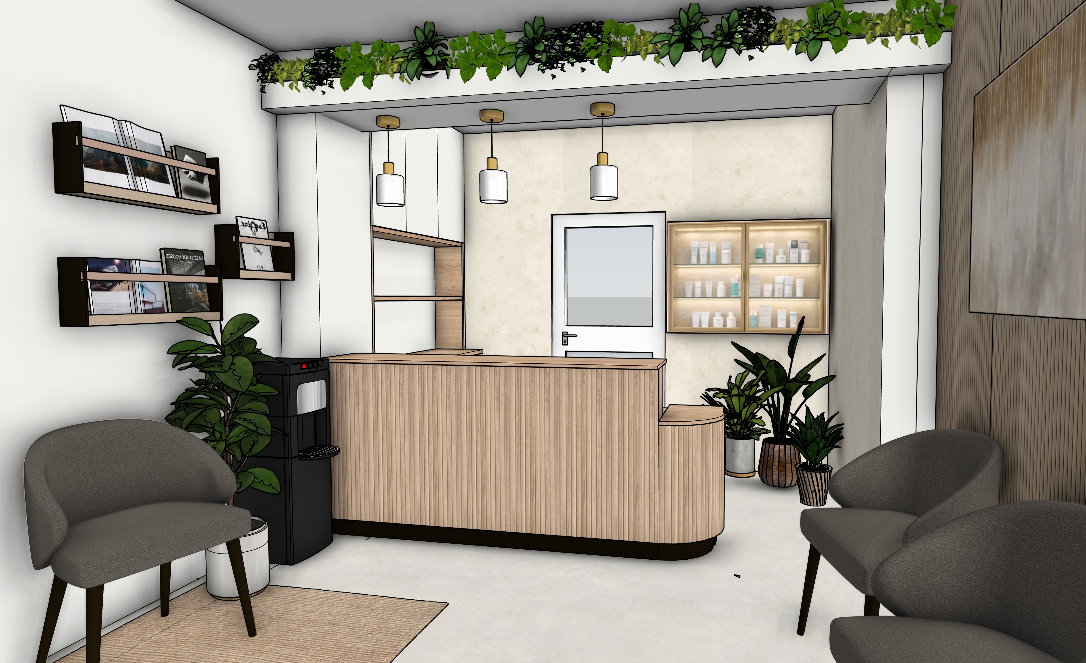 bright warm inviting waiting room reeded oak desk with black base pendant lights on black wire and brass fittings natural warm day light plants in basket pots