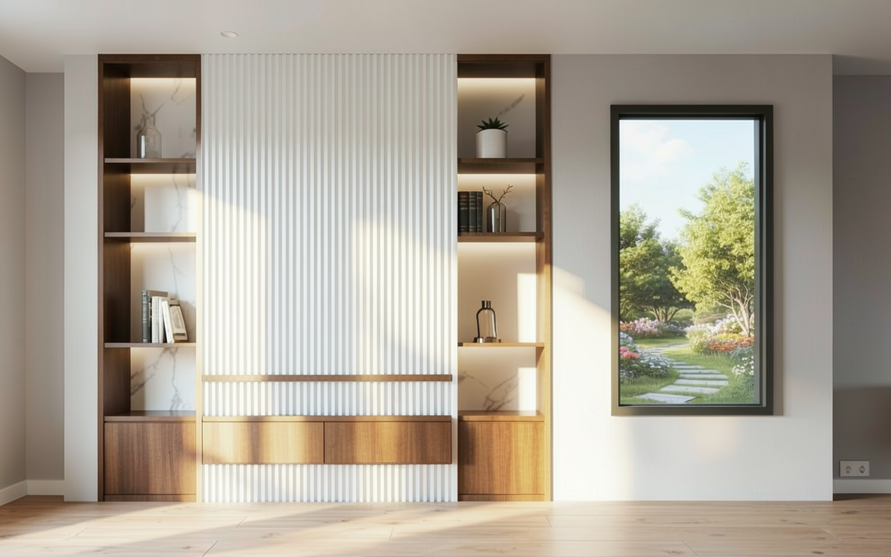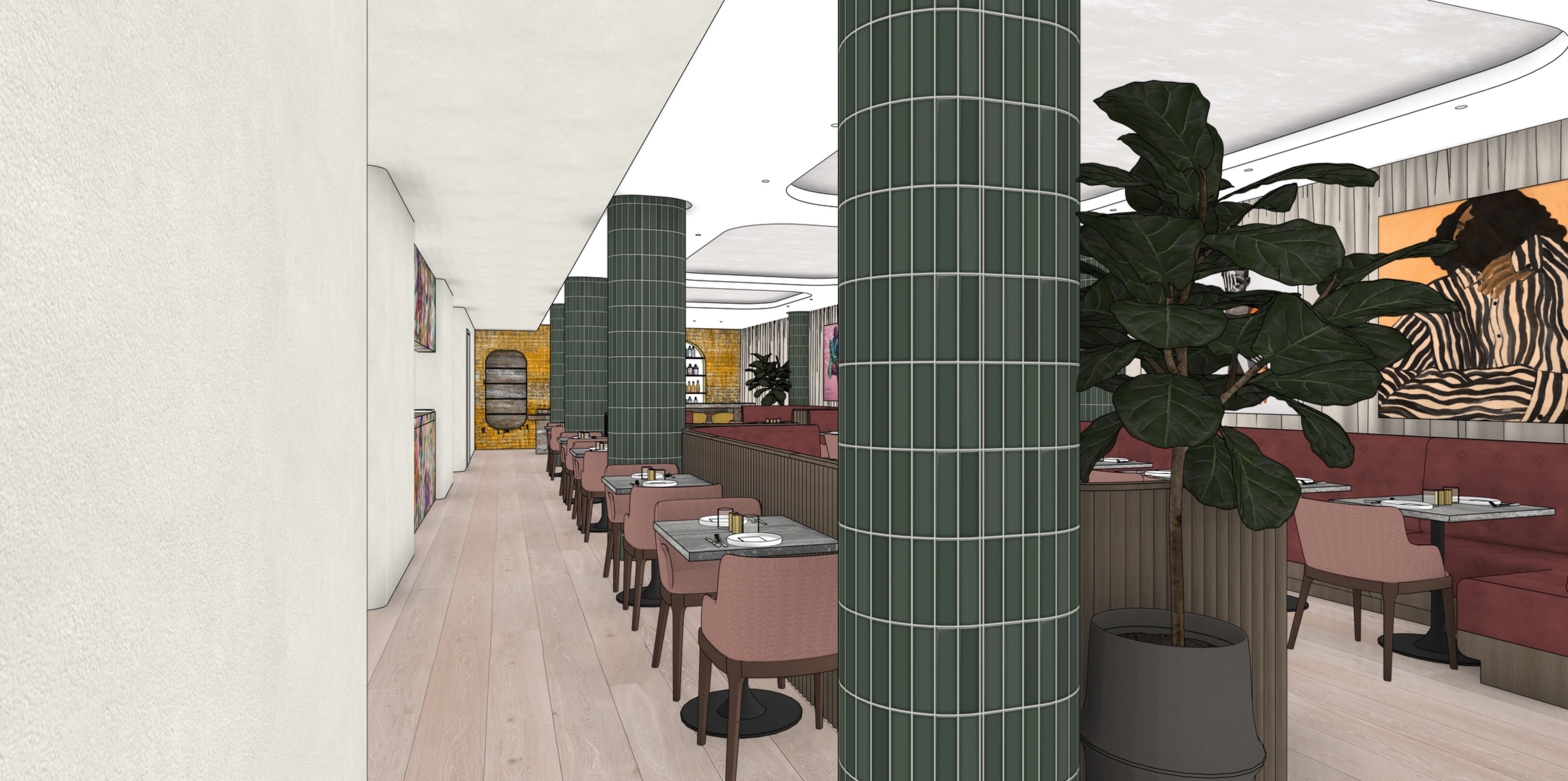 this is a restaurant below ground with no natural light the only light sources are our recessed down lights and ceiling cove lighting there also are cove lights around the oval columns at ceiling only not at bottom also the back bar is lit up from behind a frosted white glass the floor is light dinesen oak the oval columns are wrapped in green glossy ceramic tiles the bar in the back is made of chocolate travertine stone the wall behind the bar around the drinks is a mosaic pattern the dining table tops are ocean travertine stone with black metal base beige velvet curtains on right side walls of image and behind artwork the banquettes have fluted ribbed walnut back and sides the fabric is a medium dark burgundy velvet with thuftings to add more texture the dining chairs legs are dark walnut the fabric is a light burgundy woven fabric the bar stools are a dark mustard fabric with dark walnut legs there is a small bit of a kitchen visible on the middle left side of the image that little visible front is a floral wallpaper the rest of the left wall is painted beige the ceiling is painted white the middle of the cove is concrete the dropped ceiling and the wall on the left side of the image is painted beige overall atmosphere warmly bright